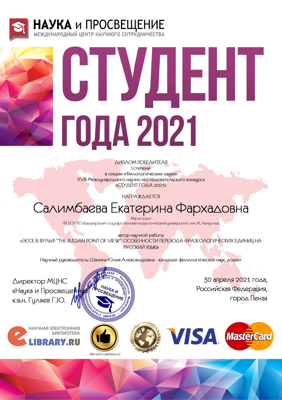 30 апреля 2021 года были объявлены результаты XVIII Международного научно-исследовательского конкурса «Студент года 2021» (МЦНС «Наука и просвещение», г. Пенза). Работа магистранта первого года обучения Е.Ф. Салимбаевой «Эссе В. Вульф "The Russian Point of View”: особенности перевода фразеологических единиц на русский язык» (научный руководитель к.ф.н., доцент Ю.А. Шанина) была отмечена дипломом первой степени.