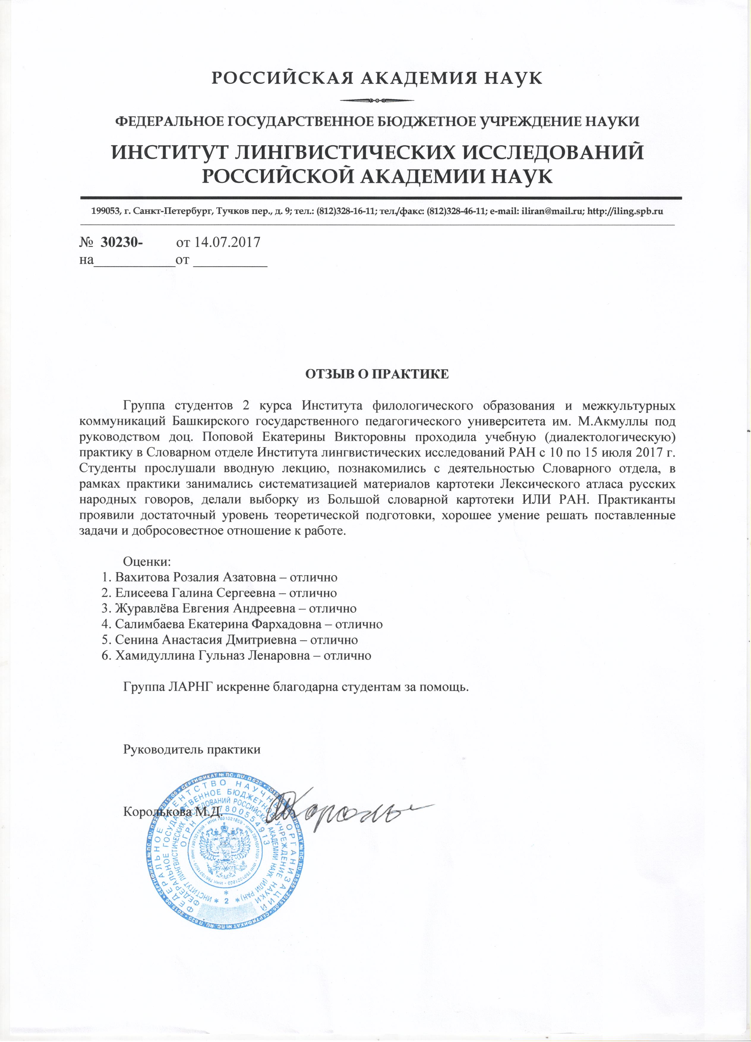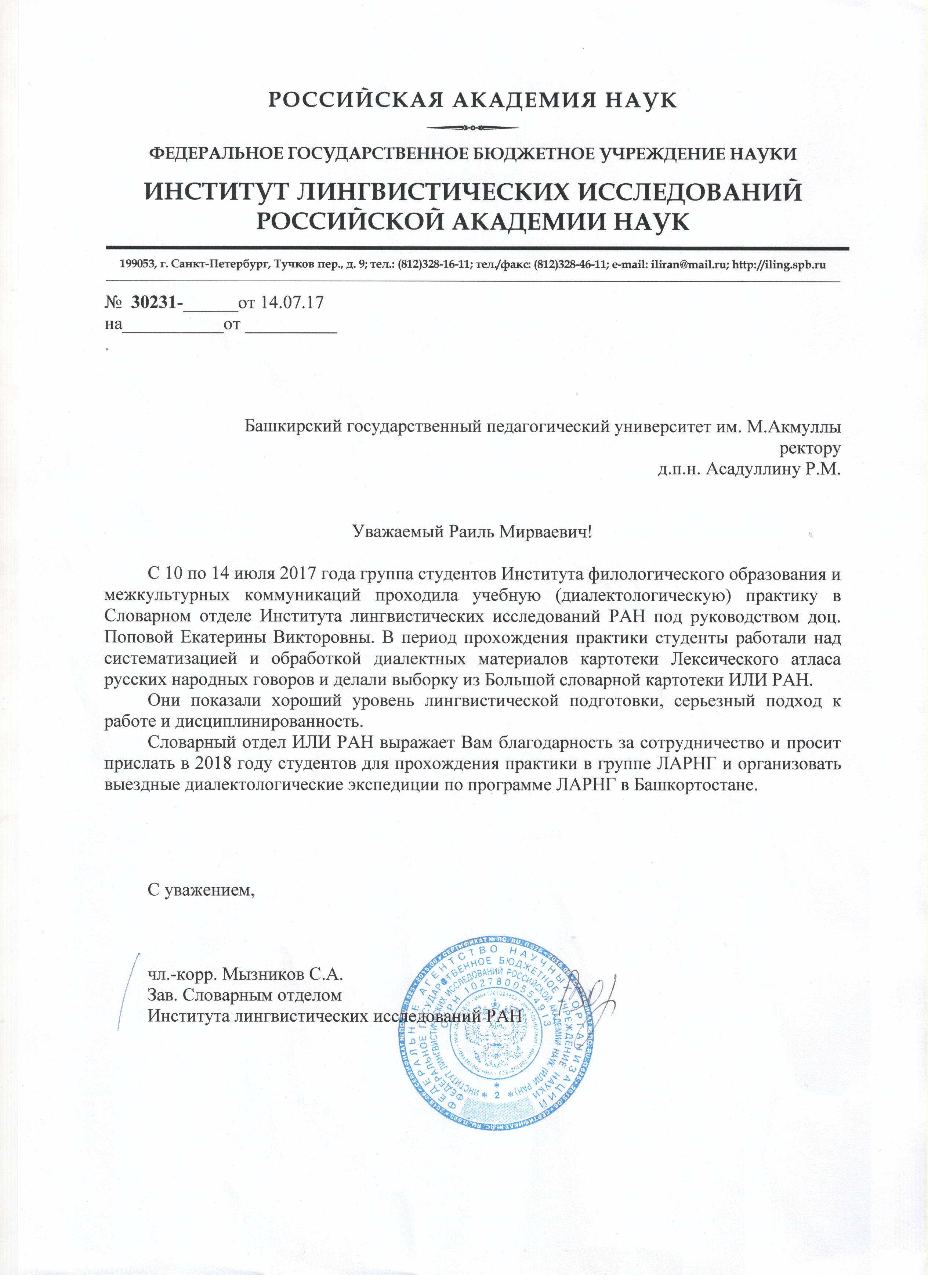 Под руководством доцента кафедры общего языкознания  Е.В. Поповой  будущие филологи прошли практику в Институте лингвистических исследований Российской Академии наук (г. Санкт-Петербург). Бакалавры Института филологического образования и межкультурных коммуникаций занимались систематизацией языкового материала по программе «Лексический атлас русских народных говоров».  Студенты  БГПУ им. М. Акмуллы получили очень высокую оценку за свою работу. Заведующий словарным отделом ИЛИ РАН, член-корреспондент С.А. Мызников в своём письме ректору университета Р.М. Асадуллину выразил благодарность за хорошую подготовку студентов-филологов и предложил дальнейшее сотрудничество.