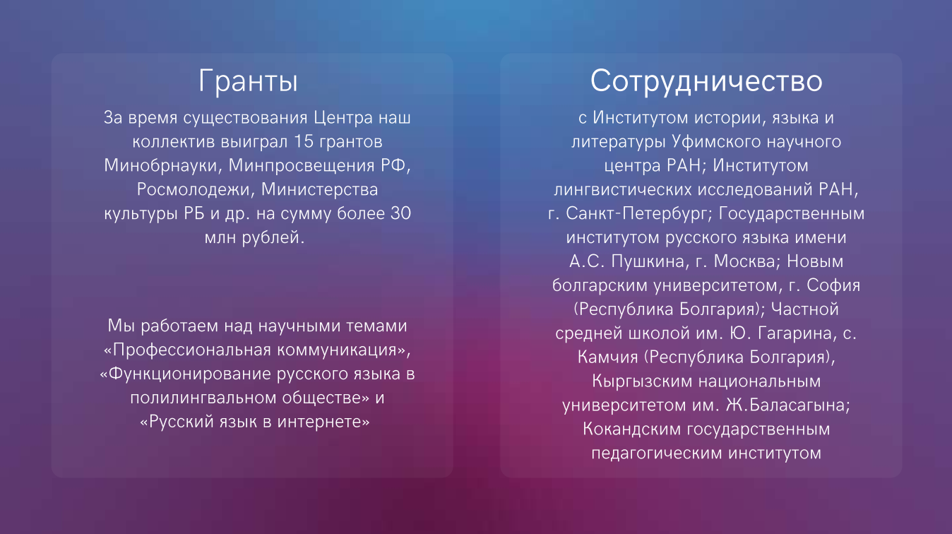 «Евразийский научно-методический центр «СЛОГ» является федеральной инновационной площадкой Министерства образования и науки России. При Центре в очном и дистанционном формате ведется дополнительная общеобразовательная программа по подготовке иностранных граждан и лиц без гражданства к профессиональному обучению на русском языке. Также работает онлайн-школа СЛОГ для желающих изучать русский язык как иностранный с нулевого уровня, проводятся онлайн-заседания профильного клуба по интересам СЛОГ. Специалисты центра оказывают научно-методическую помощь учителям, организующим обучение на русском языке за рубежом, и проводят общественно-значимые мероприятия для школьников и студентов, посвящённые русскому языку и культуре. Вся деятельность центра освещается на страницах в социальных сетях «СЛОГ» Вконтакте, «СЛОГ» Телеграм и Лингвистической академии им.Т.М.Гарипова. Мы учим русскому языку весь мир!
