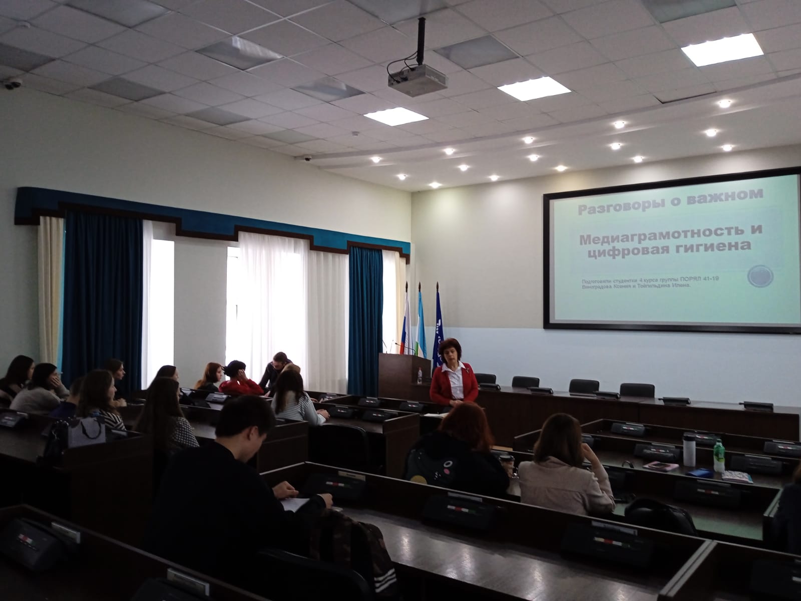 23 января 2023 года состоялся кураторский час на тему  «Медиаграмотность и цифровая гигиена», проведенный в рамках всероссийского  проекта «Разговоры о важном» для  студентами 1 курса ПОРЯЛ.  Занятие было подготовлено и проведено студентами 4 курса направления подготовки «Русский язык и литература» И.  Тойгильдиной и К. Виноградовой под руководством заведующей кафедрой русской литературы Ю.А. Шаниной. Студенты рассказали первокурсникам о правилах цифрового этикета, базовых принципах кибербезопасности, а также поделились важной информацией об Интернет-ресурсах, необходимых для подготовки к занятиям по филологическим дисциплинам, написания научных статей и курсовых работ. С помощью QR-кода ведущие передали участникам встречи  материалы, ссылки, которые подобрали по данной теме.