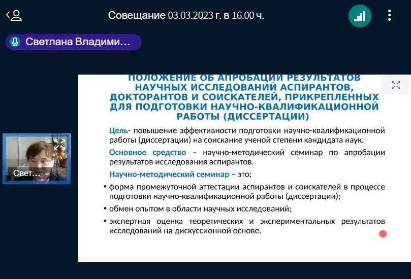 03 марта состоялось совещание по вопросу организации научно-методических семинаров по аттестации аспирантов во втором семестре 2022-2023 уч. года. В 2022 году было утверждено новое положение о научно-методическом семинаре как форме аттестации аспирантов, отметила заведующий отделом аспирантуры БГПУ им. М. Акмуллы Светлана Рябова и предложила апробировать новую систему промежуточной аттестации аспирантов, включающую вариативность представления результатов работы аспирантов (выступление по теоретическим или практическим результатам исследования, представление научной публикации, обоснование темы и структуры исследования).