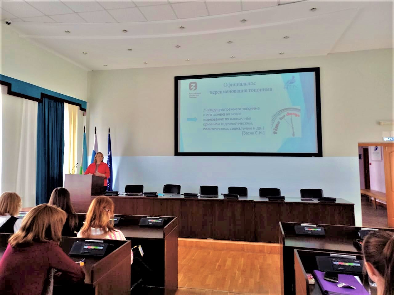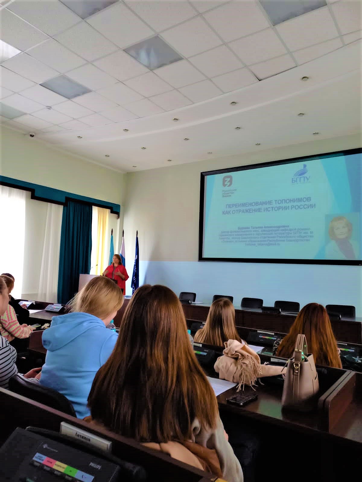 18 апреля 2023 года состоялась лекция профессора БГПУ им. М. Акмуллы Бурковой Татьяны Александровны на тему «Переименование топонимов как отражение истории России». Слушатели узнали мотивы переименования городов, познакомились с городами России, которые были переименованы в разные периоды развития российского общества по идеологическим причинам.