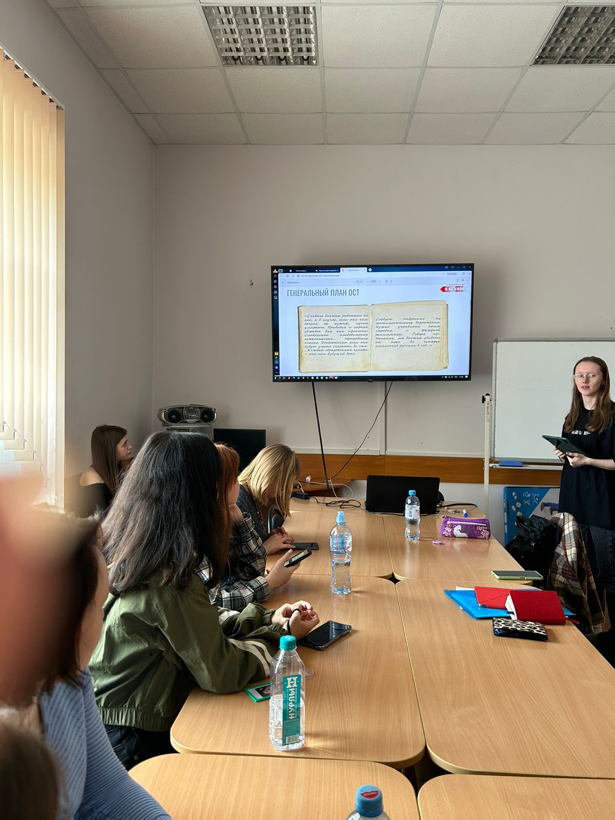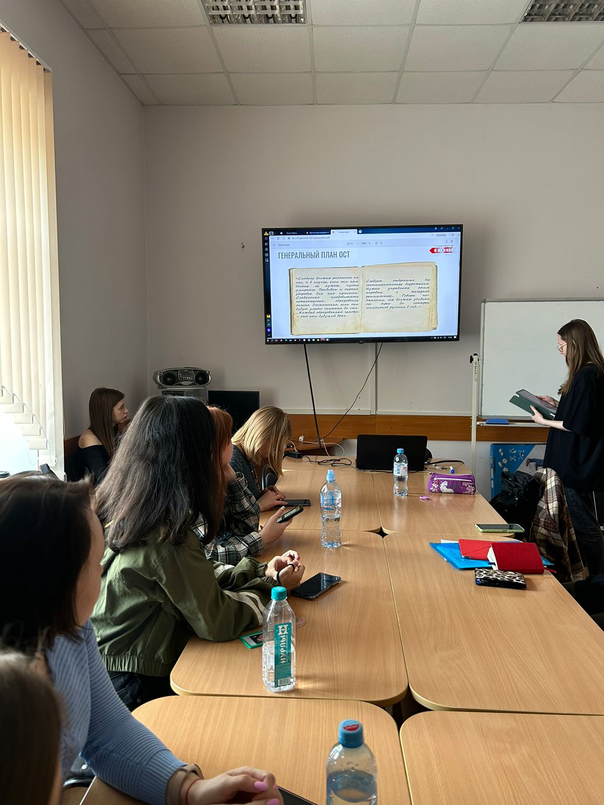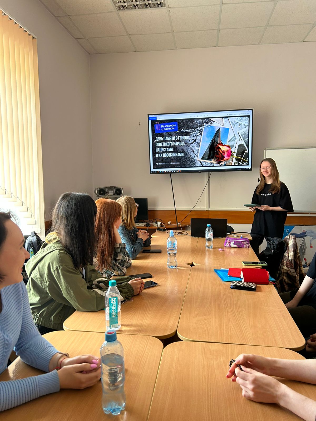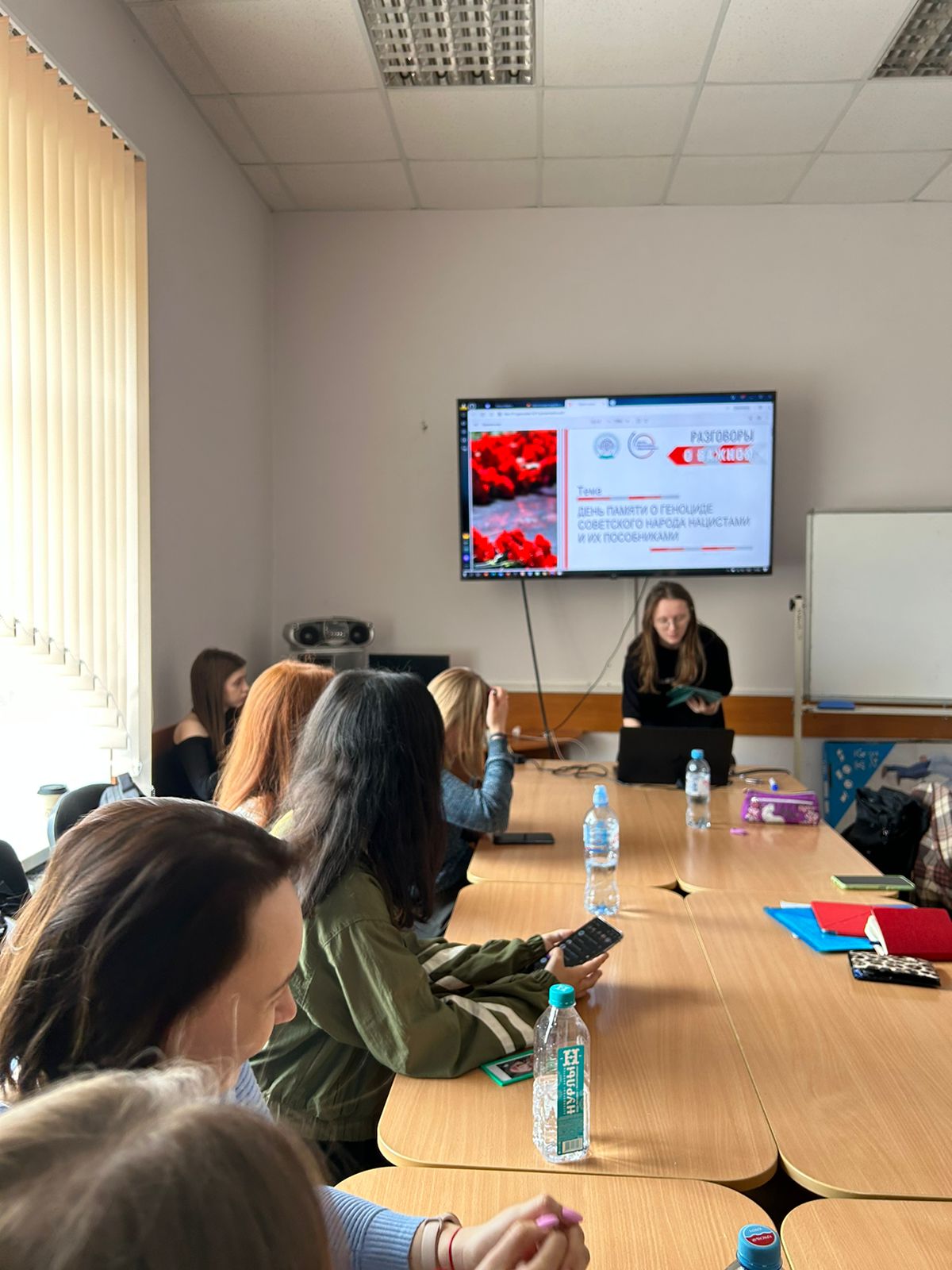 20 апреля 2023 года на 3 курсе направления подготовки «Педагогическое образование», профиль «Иностранный (английский) и немецкий язык» в рамках проекта «Разговоры о важном» прошел кураторский час на тему «День памяти о геноциде советского народа нацистами и их пособниками». Цель занятия: формирование у обучающихся понимания необходимости сохранения исторической правды, памяти и преемственности поколений на примере истории геноцида мирных советских граждан со стороны нацистов и их пособников в годы Великой Отечественной войны 1941–1945 гг. На занятии обучающиеся познакомились с важнейшими фактами преступлений против мирных граждан со стороны нацистов и их пособников в годы Великой Отечественной войны и в настоящее время (докладчик Изиляева Е.). В заключении прошло обсуждение с обучающимися проблемных вопросов; сделаны выводы о необходимости сохранения исторической памяти; отмечено, что события Второй мировой и борьбы с фашизмом до сих пор являются актуальной политической повесткой.