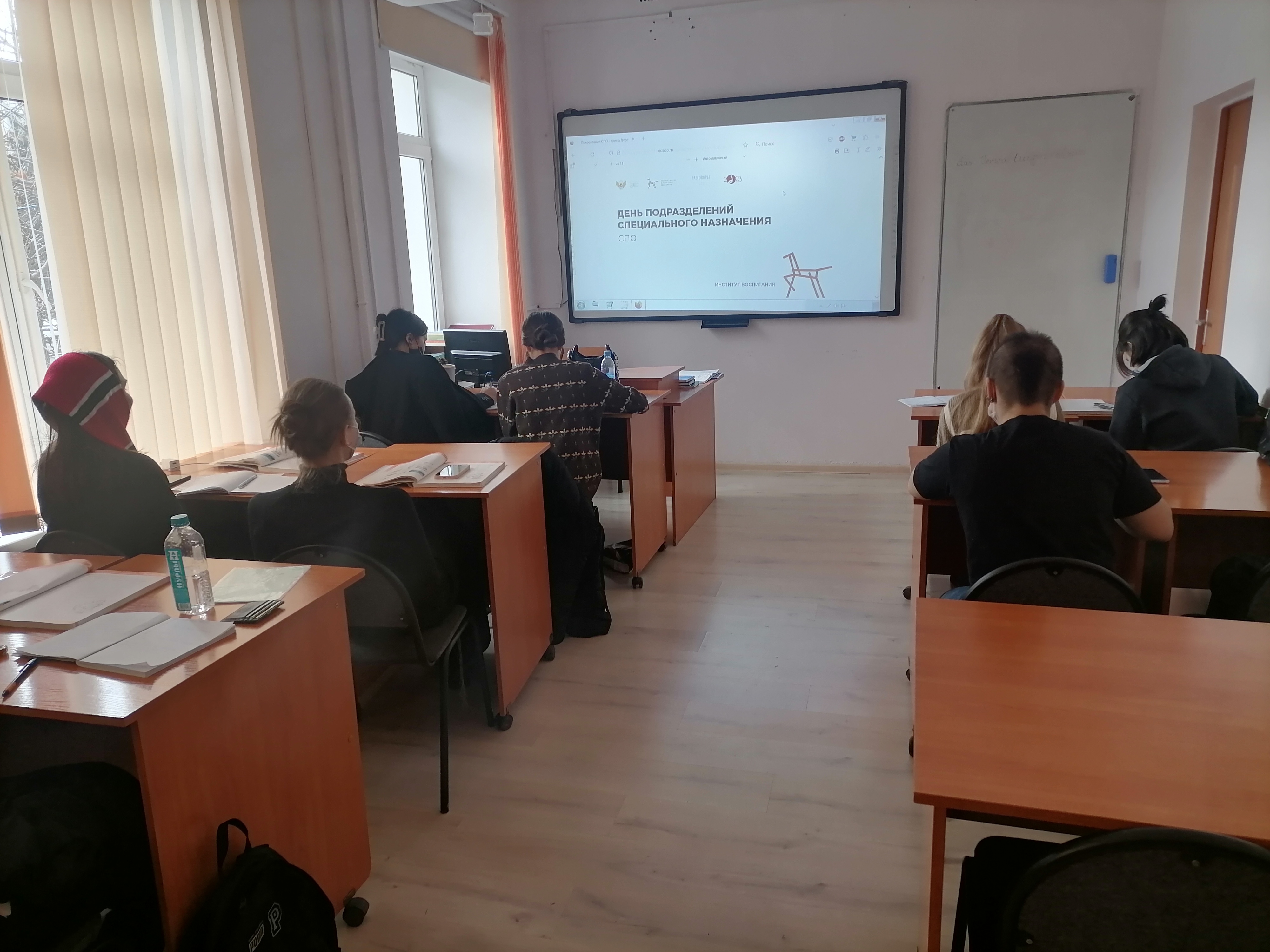 23  октября   2023 года заместитель директора по ВРиМП Т.А. Акбердина провела занятие по теме «День подразделений специального назначения» со студентами группы ЛИНПП-41-20. Занятие началось с просмотра отрывка из легендарного фильма «Офицеры». Студенты рассуждали о значении ставшей крылатой фразы из этого киношедевра «Есть такая профессия – Родину защищать». После просмотра видеоролика об истории возникновения особых военных формирований была представлена презентация о современных подразделениях спецназа, таких как Альфа и Вымпел.