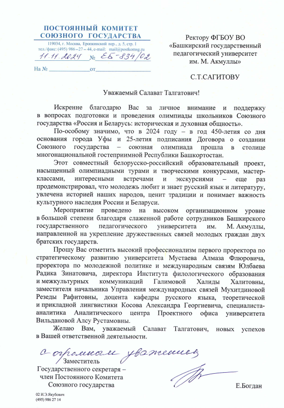 Акмуллинский университет получил благодарность Постоянного Комитета Союзного государства