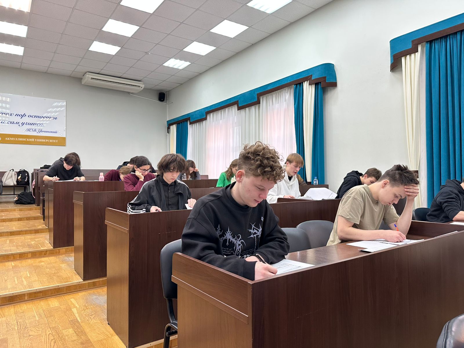 26 апреля 2025 года в Акмуллинском университете состоялся заключительный этап учебно-тренировочных сборов по подготовке к ЕГЭ по русскому языку и литературе для школьников города Уфы. Репетиционные экзамены по русскому языку и литературе в формате ЕГЭ проходили в течение двух месяцев по субботами на базе Института филологического образования и межкультурных коммуникаций. Их цель – оценить степень готовности выпускников к итоговой аттестации и способствовать повышению уровня образовательных результатов. В мероприятии приняли участие более ста обучающихся 10-х и 11-х классов уфимских школ. Оно было организовано по инициативе кафедр русской литературы и русского языка, теоретической и прикладной лингвистики. С приветственным словом к обучающимся обращалась заведующая кафедры русской литературы Ю.А. Шанина. Она желала участникам удачи и приглашала будущих абитуриентов продолжить обучение по образовательным программам Акмуллинского университета.