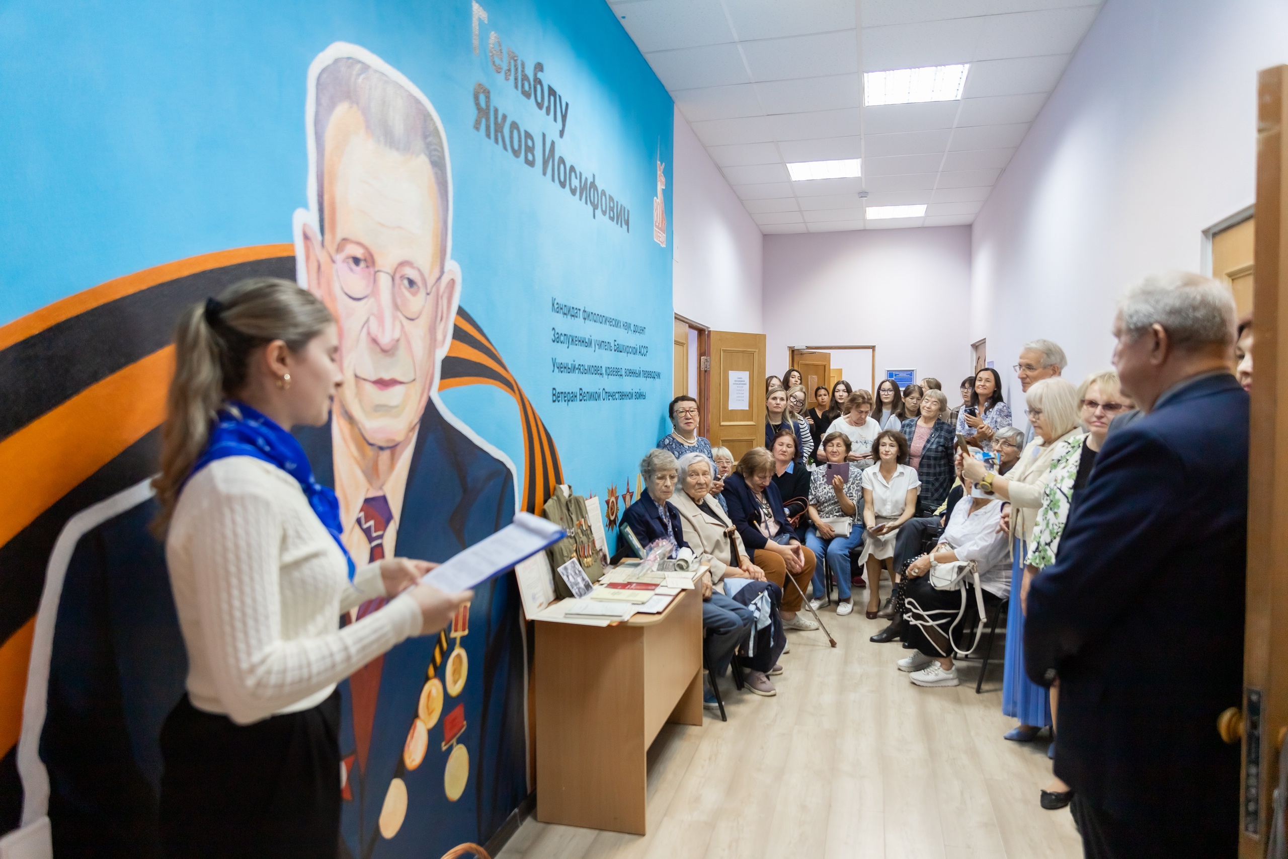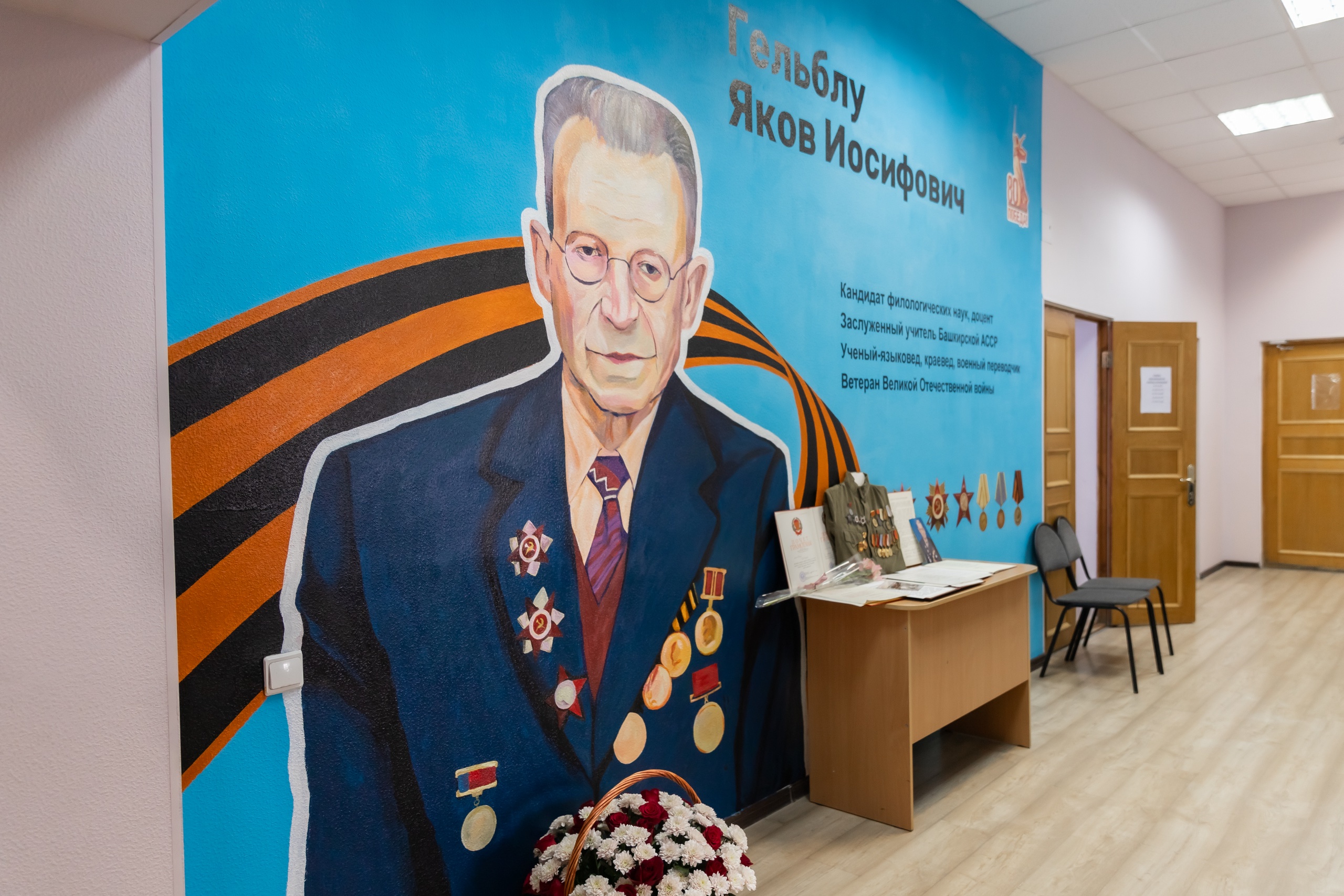 В этот же день, 2 сентября, в Акмуллинском университете открылись еще три мурала в разных корпусах вуза. В Институте филологического образования и межкультурных коммуникации торжественно открыли мурал, посвященный Якову Иосифовичу Гельблу. Это был уникальный человек, обладающий энциклопедическими знаниями, ученый-языковед-германист, писатель, краевед, коллекционер-филателист, кандидат филологических наук, доцент, заслуженный учитель Башкирской АССР. Яков Иосифович был участником советско-финской и Великой Отечественной войн, военным переводчиком.