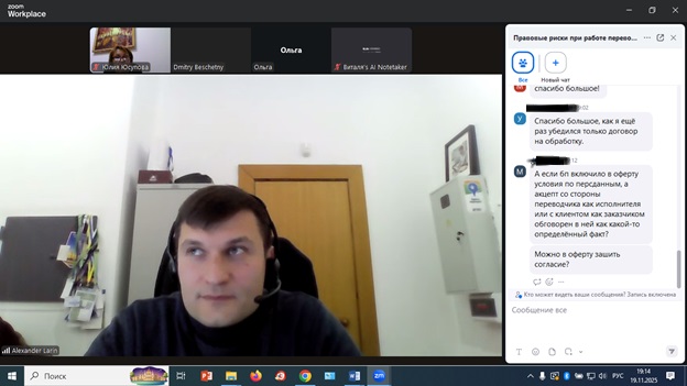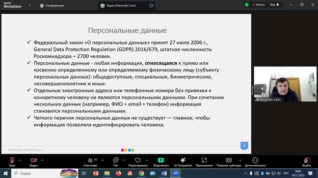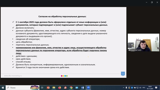 19 ноября 2025 г. состоялся вебинар «Правовые риски при работе переводчика с персональными данными», организованный Союзом переводчиков России. Целью вебинара было сформировать у представителей отрасли понимание того, как работать с персональными данными с учетом изменений, вступивших в силу 1 сентября 2025 года.