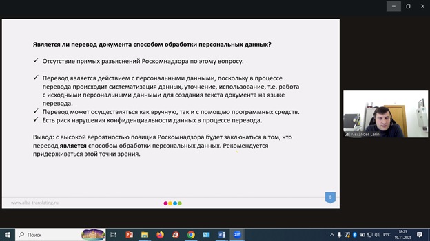 Спикер мероприятия – Александр Александрович Ларин, директор бюро переводов «Альба», канд. юрид. наук, доцент, член правления и руководитель юридической службы Союза переводчиков России, зав. кафедрой практической подготовки Высшей школы перевода НГЛУ, член комитета по судебному переводу Международной федерации переводчиков (FIT). В своем выступлении он разъяснил правовые статусы оператора и обработчика персональных данных применительно к переводческой деятельности, отличие в их ответственности при работе с персональными данными и особенности оформления согласия на обработку персональных данных. После своего содержательного доклада Александр Александрович ответил на все вопросы участников вебинара.