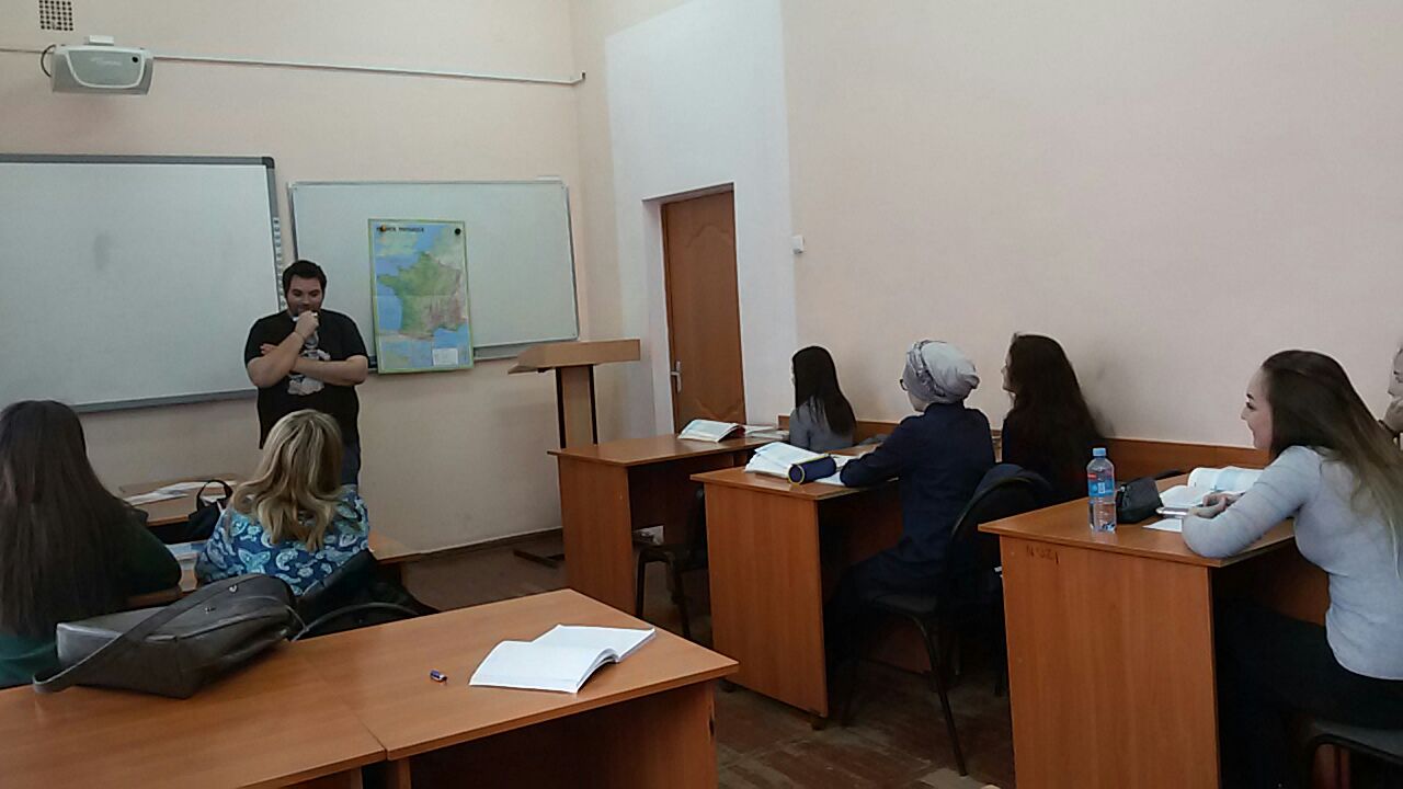 Альбина Гиззатуллина, студентка 203 л группы: Сегодня у нас состоялась встреча с преподавателем из Франции - Квентином. Он с радостью ответил на интересующие нас вопросы, рассказал не только о себе, но и о Франции. Нас очень заинтересовали рассказы Квентина, и в дальнейшем хотели бы больше общаться с носителями языка.