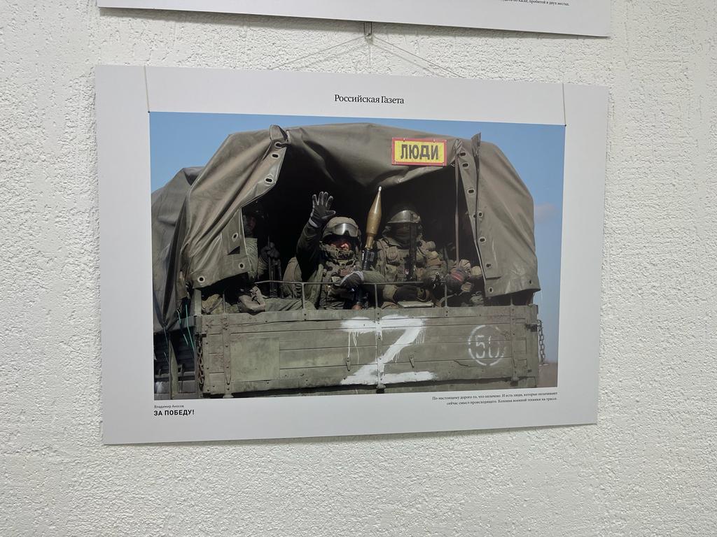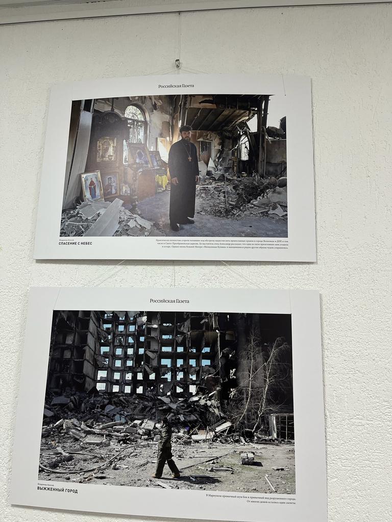 С этих слов начинается выставка фронтового корреспондента Владимира Аносова "Донбасс". Им представлены фотографии, которые отражают жизнь мирных жителей и российских военных, находящихся в условиях боевых действий. Сжимается сердце от фотографий с невинными детьми, вынужденными испытывать весь ужас жестокости нацизма. Дома, в которых когда-то жили люди, культурные объекты теперь лежат в руинах. Российские военные рискуют своими жизнями и делают всё возможное для защиты мира от коричневой чумы. Глядя на эти фотографии, действительно тяжело поверить, что такой ужас может происходить в наше время.