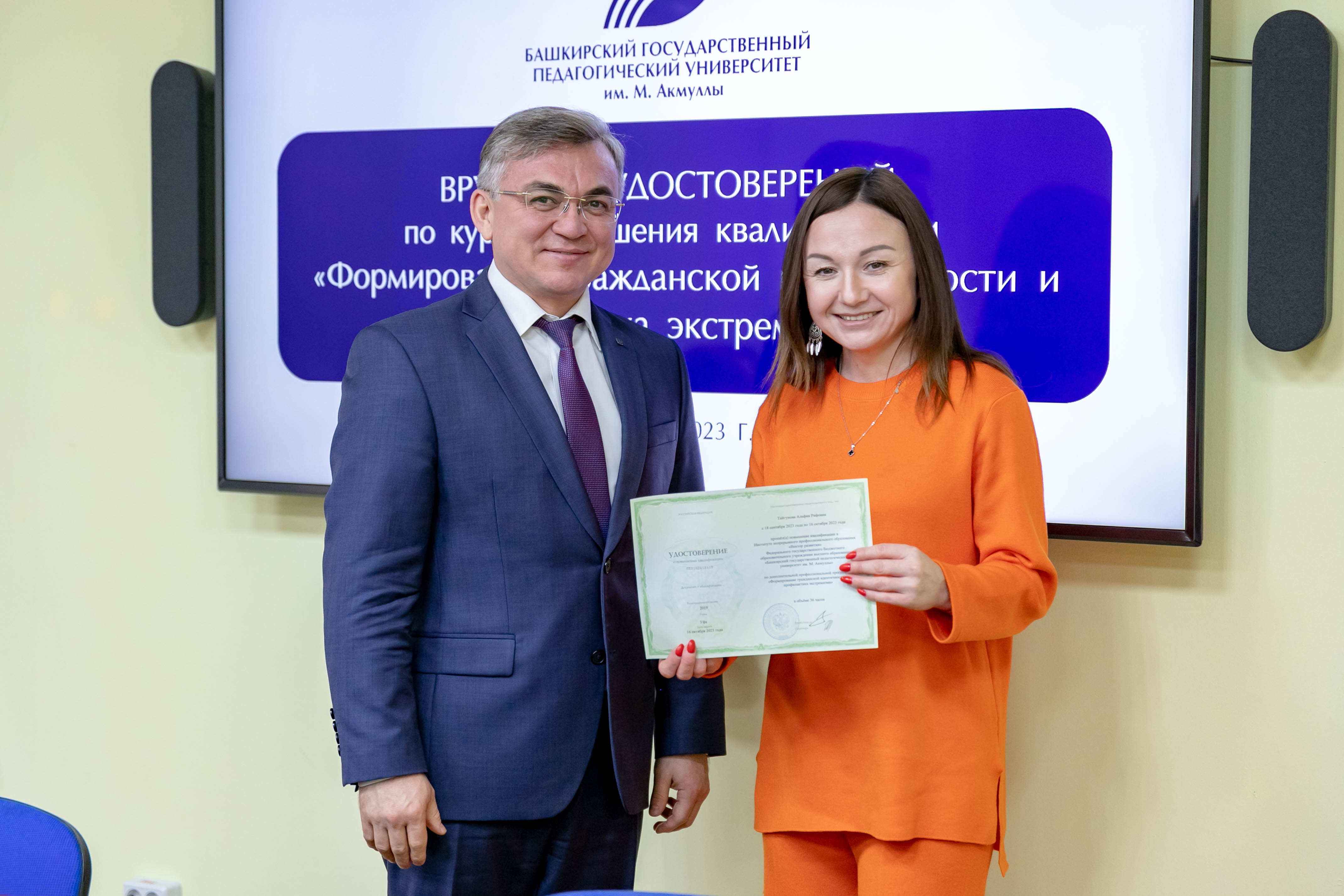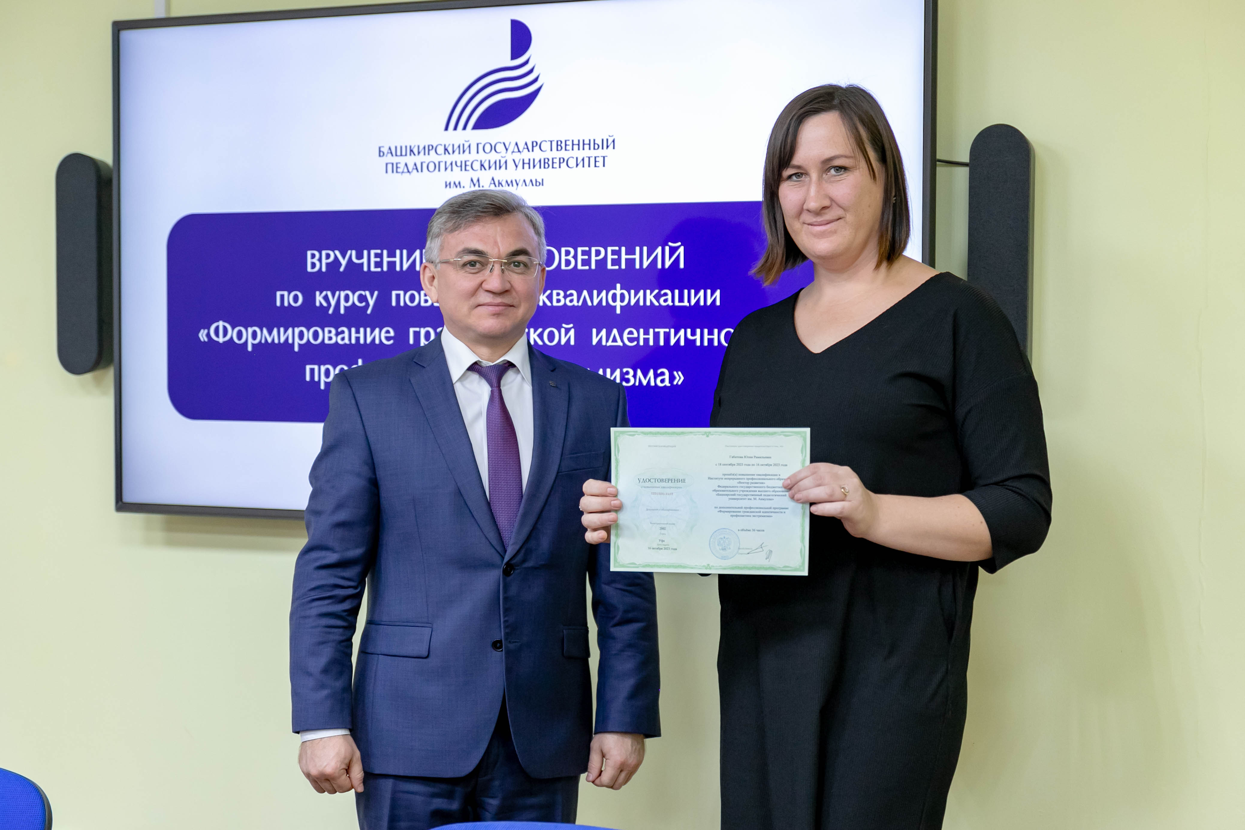 31 октября 2023 года прошло официальное вручение удостоверений слушателям программы повышения квалификации «Формирование гражданской идентичности и профилактика экстремизма». Документ, удостоверяющий прохождение курса повышения квалификации, вручал директор Координационного центра по противодействию идеологии терроризма и экстремизма Акмуллинского университета Ильгам Хабибуллин.