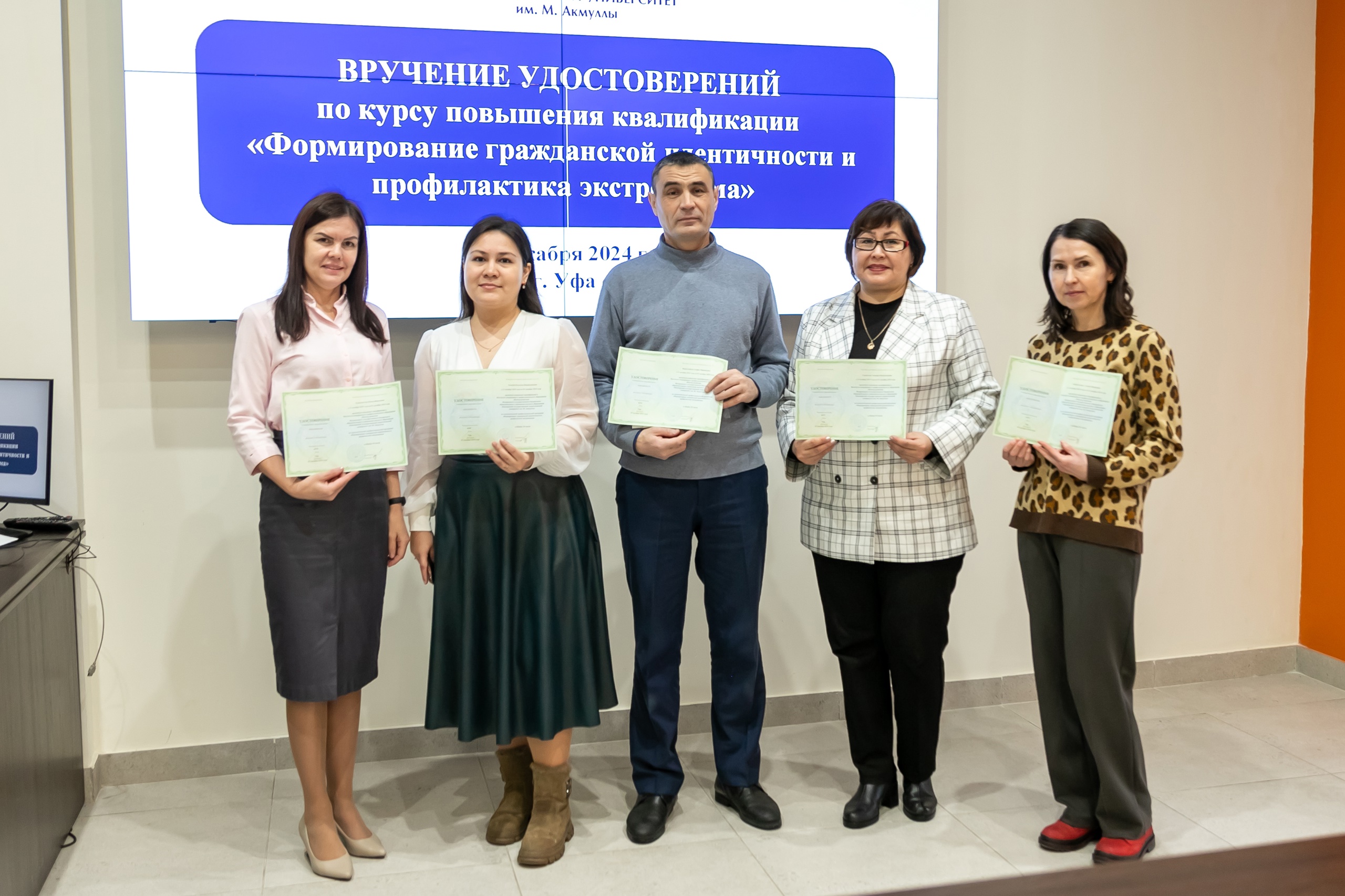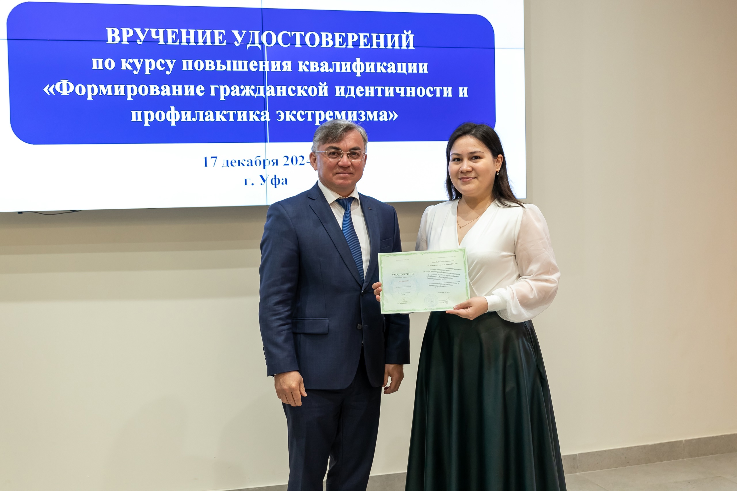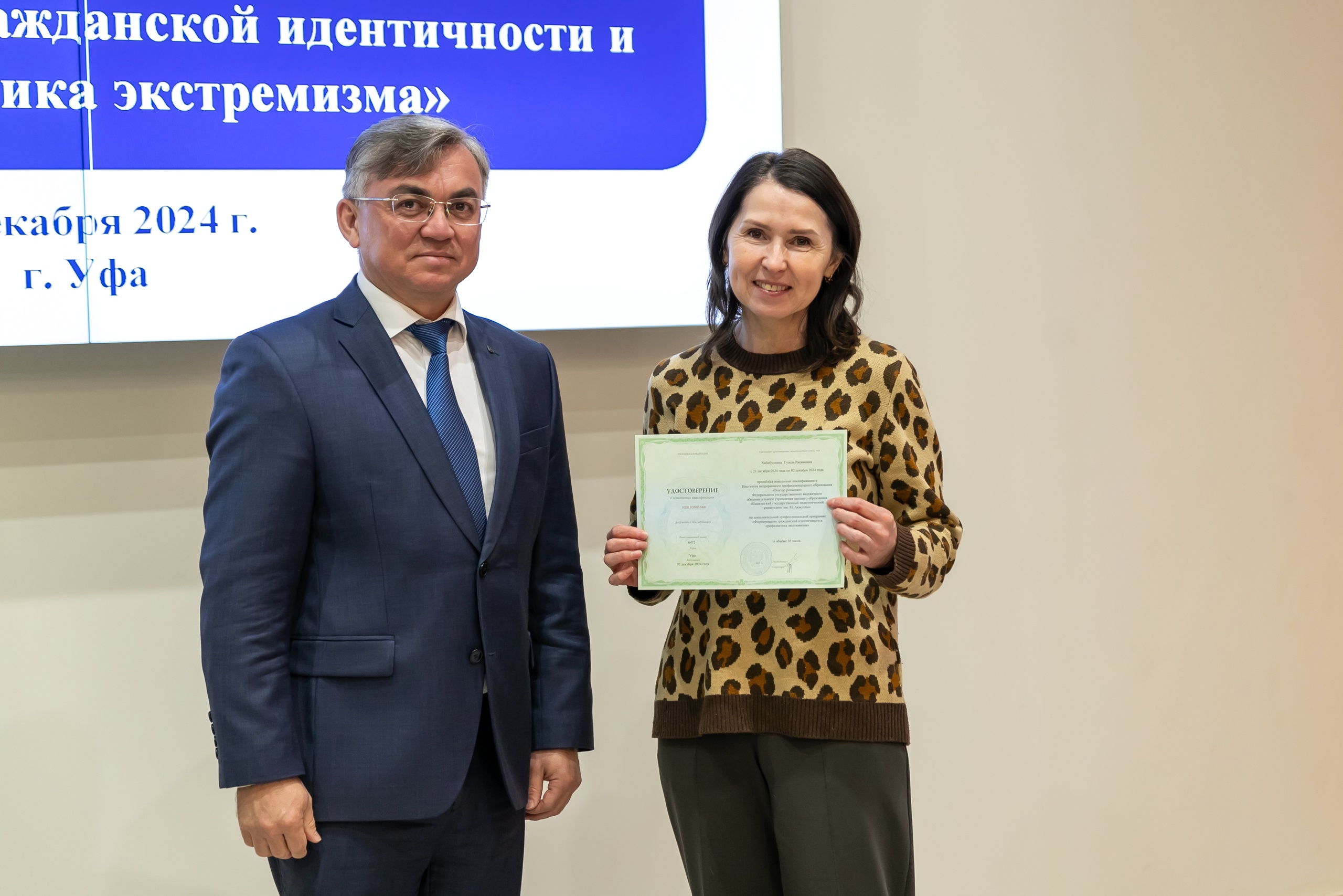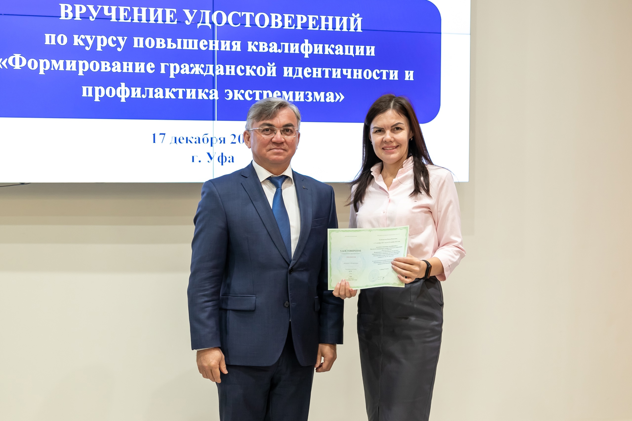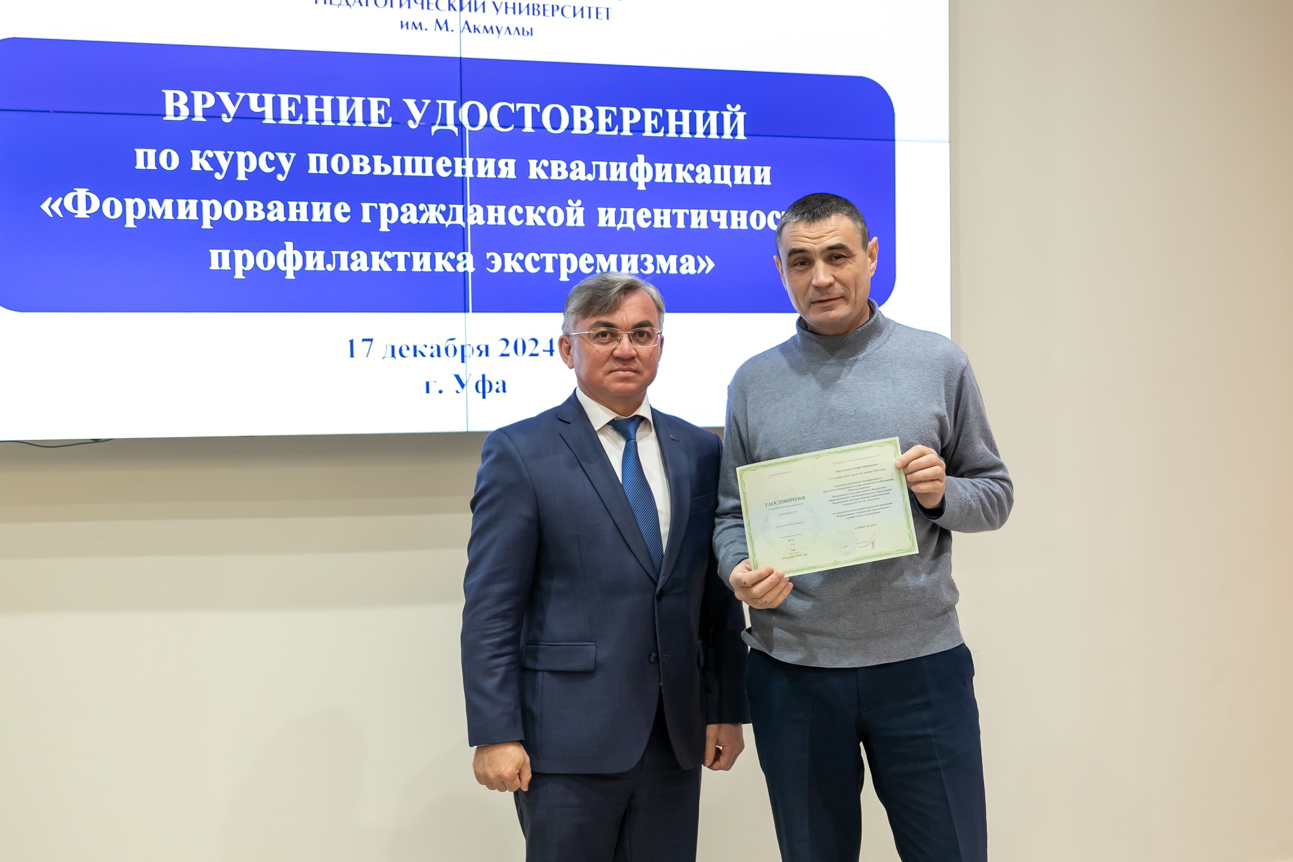 17 декабря состоялось вручение удостоверений слушателям курса повышения квалификации «Формирование гражданской идентичности и профилактика экстремизма». Обучение проходило в дистанционном формате с 21 октября по 2 декабря 2024 года. В рамках программы свои навыки успешно повысили педагогические работники города Уфы, а также Дюртюлинского и Чекмагушевского районов. Удостоверения о прохождении курса вручил слушателям директор Координационного центра по противодействию идеологии терроризма и экстремизма БГПУ им. М.  Акмуллы, советник при ректорате Ильгам Хабибуллин.