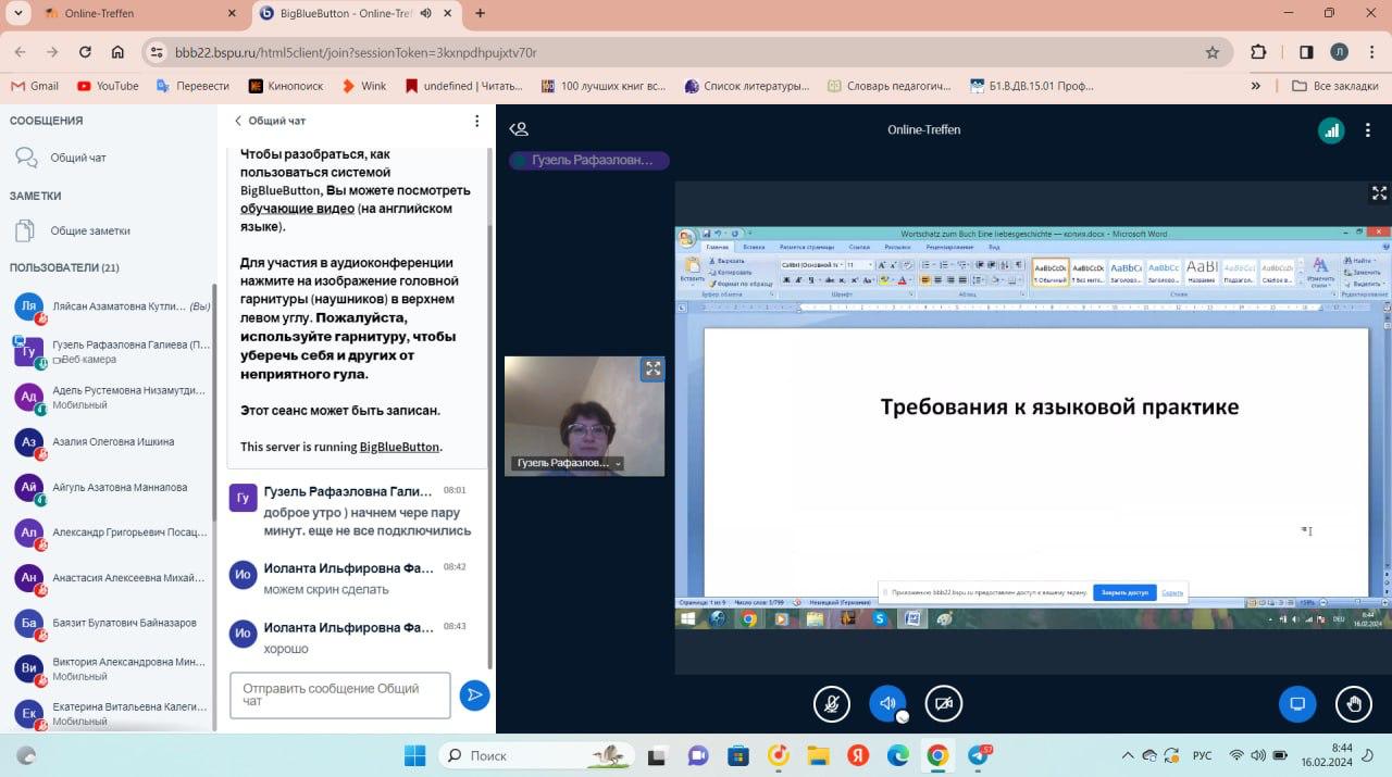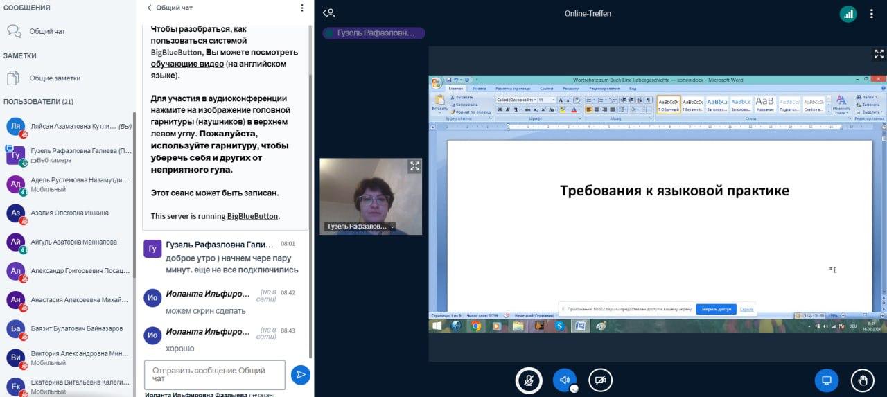 16.02.2024 г. в онлайн-формате прошла установочная конференция по учебной языковой практике по немецкому языку студентов 2 курса направления  подготовки «Педагогическое образование», направленность (профиль) «Английский язык и немецкий язык». Практика будет проходить с 16.02.24 г. по 24.05.24 г. на базе кафедры романо-германской филологии и методики обучения иностранным языкам и включает в себя задания, направленные на развитие всех видов речевой деятельности. Во время установочной конференции студенты были ознакомлены с содержанием данных заданий и с требованиями по их выполнению и заполнению отчетной документации.