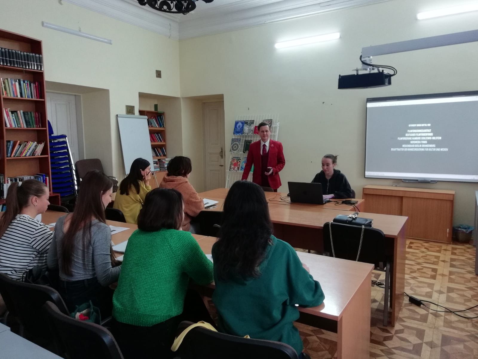 12.03.2024 г. по приглашению Немецкого читального зала Национальной библиотеки им. А.-З. Валиди студенты группы ПО-АЯ-НЯ-41-20 посетили в рамках языковой практики лекцию, посвящённую 120-летию немецкого писателя Бодо Узе. Студенты узнали об основных вехах творческого пути автора, познакомились с наиболее значимыми произведениями писателя. Кроме того, студентам была представлена выборка книг для индивидуального чтения на изучаемом языке.