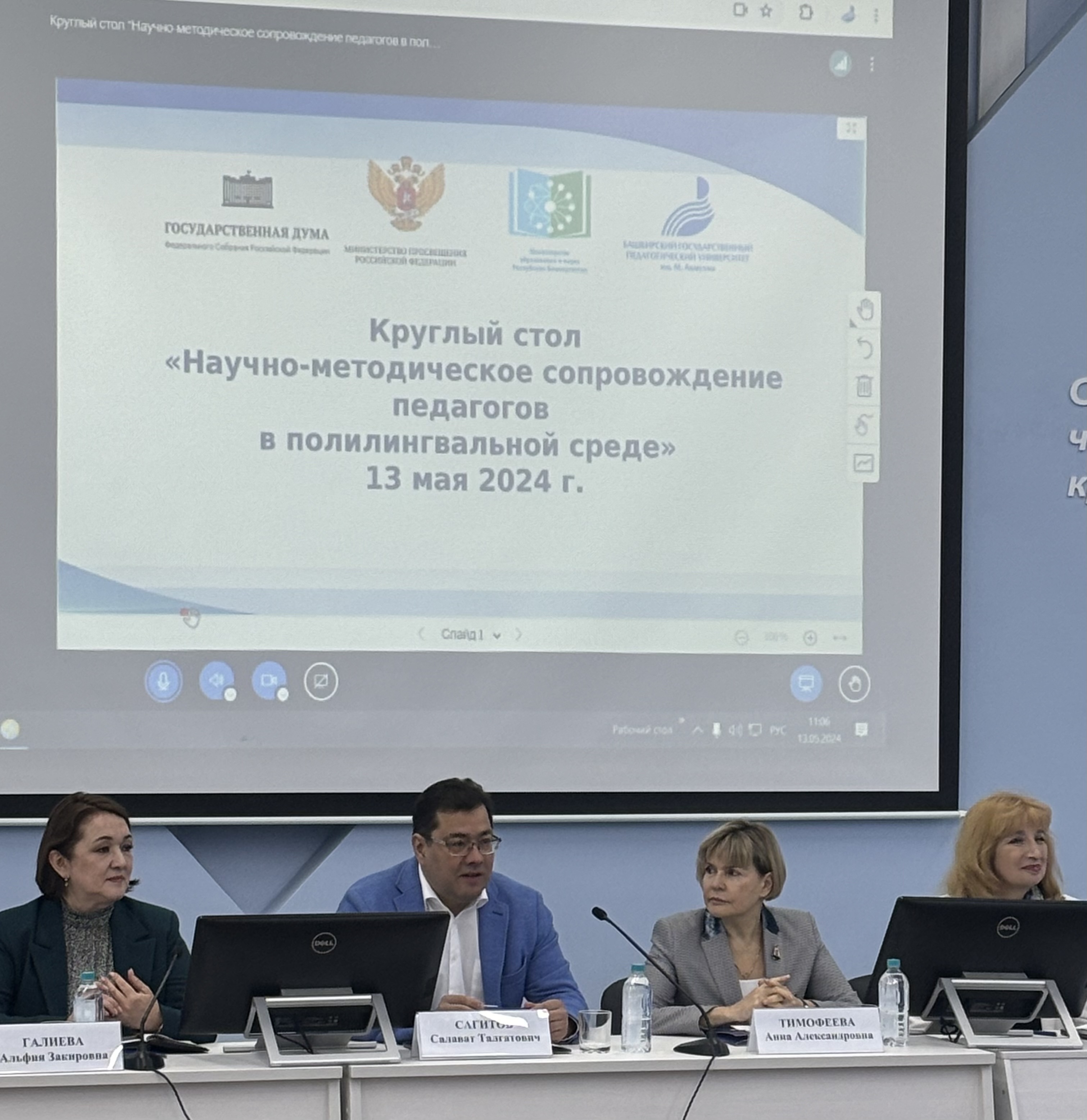 13 мая 2024 г. в БГПУ им. М.Акмуллы прошел круглый стол «Научно-методическое сопровождение педагогов в полилингвальной среде» (модератор – Сагитов С.Т., депутат Государственного Собрания – Курултая Республики Башкортостан, ректор Акмуллинского университета). С приветствиями выступили Аиткулова Э.Р., депутат Государственной Думы Российской Федерации, член Комитета по просвещению; Тимофеева А.А., заместитель директора Департамента государственной политики и управления в сфере общего образования Минпросвещения России; Юсупова Г.Р., директор АНО по сохранению и развитию башкирского языка.