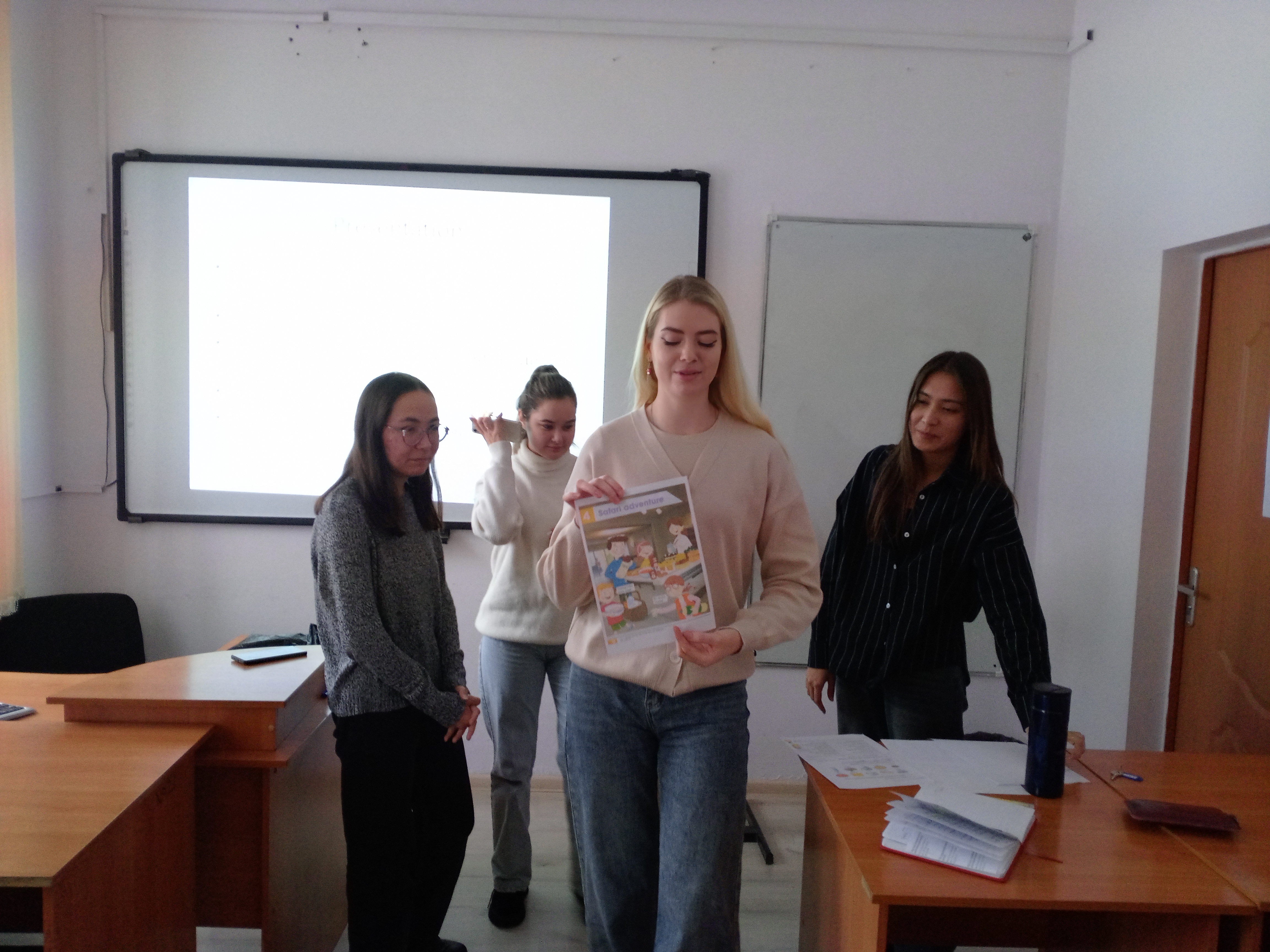 Были подробно представлены этапы урока английского языка, а именно какие методические приемы необходимо использовать в начале урока, чтобы настроить учеников на рабочий лад. Как следует проверять домашнюю работу. Как вводить новую тему, как отрабатывать изученный материал, как подводить итоги урока.  Студентам было предложено провести фрагменты урока, а именно этап – представление нового материала.  Студенты подошли к решению данной задачи творчески, разделившись на малые группы и работая совместно