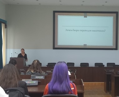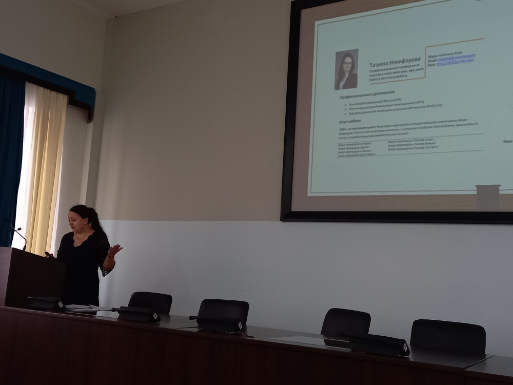 Елена Анатольевна поделилась ценным опытом, связанным с работой переводчика, рассказала о принципах работы в бюро перевода, возможностях трудоустройства, критериях, предъявляемых к резюме, и пригласила студентов к участию в проектах по лингвистическому сопровождению значимых мероприятий в РБ и в мероприятиях Уфимского переводческого клуба.