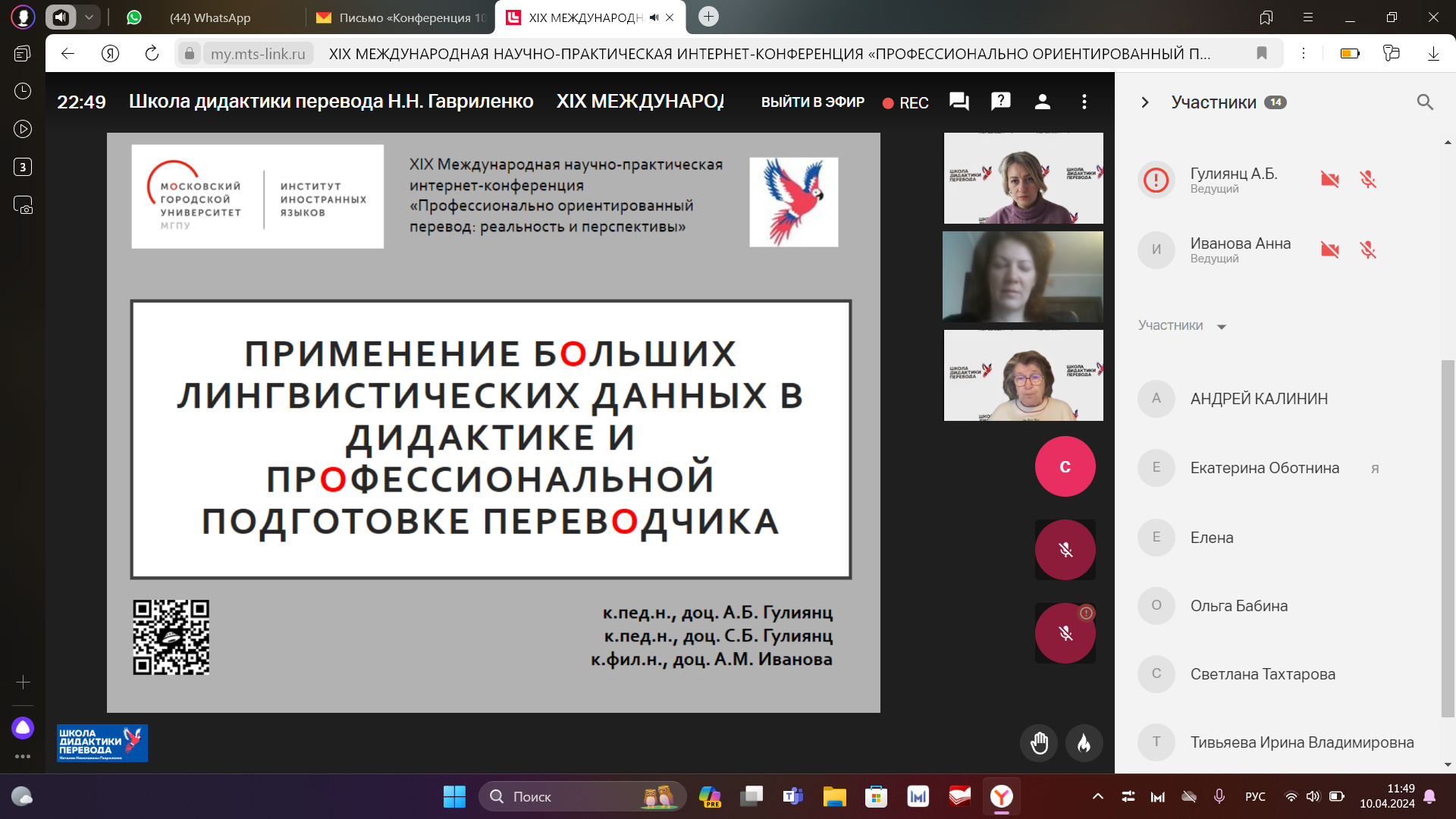 8-10 апреля 2024 г. состоялась  XIX Международная научно-практическая интернет-конференция «Профессионально-ориентированный перевод: реальность и перспективы». Организаторами конференции стали ведущие вузы Российской федерации и переводческие организации: РУДН, МГЛУ, МГПУ, ЧГУ, Ассоциация преподавателей перевода, Союз переводчиков России, Бюро переводов «АКМ-Вест» и Школа дидактики перевода.