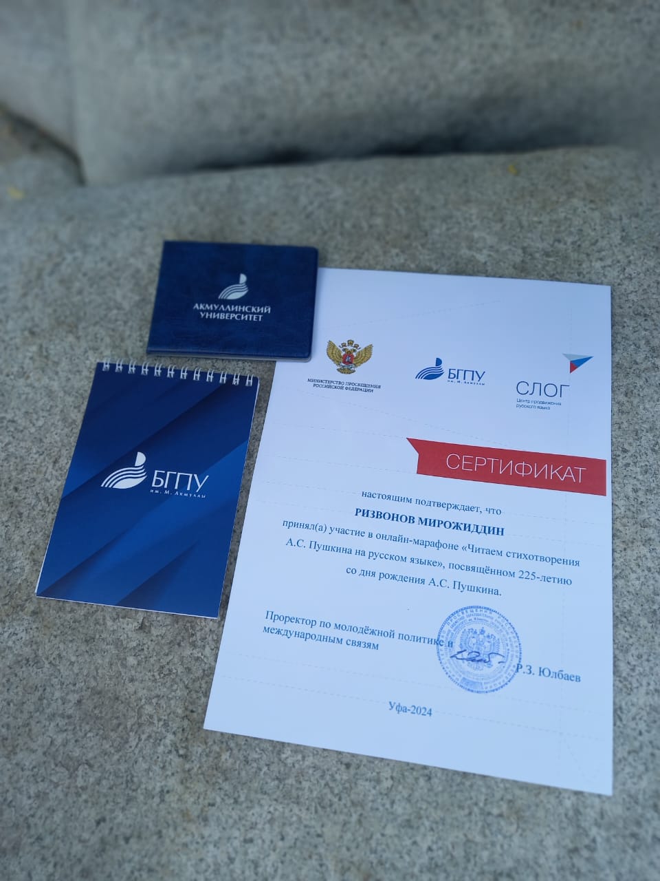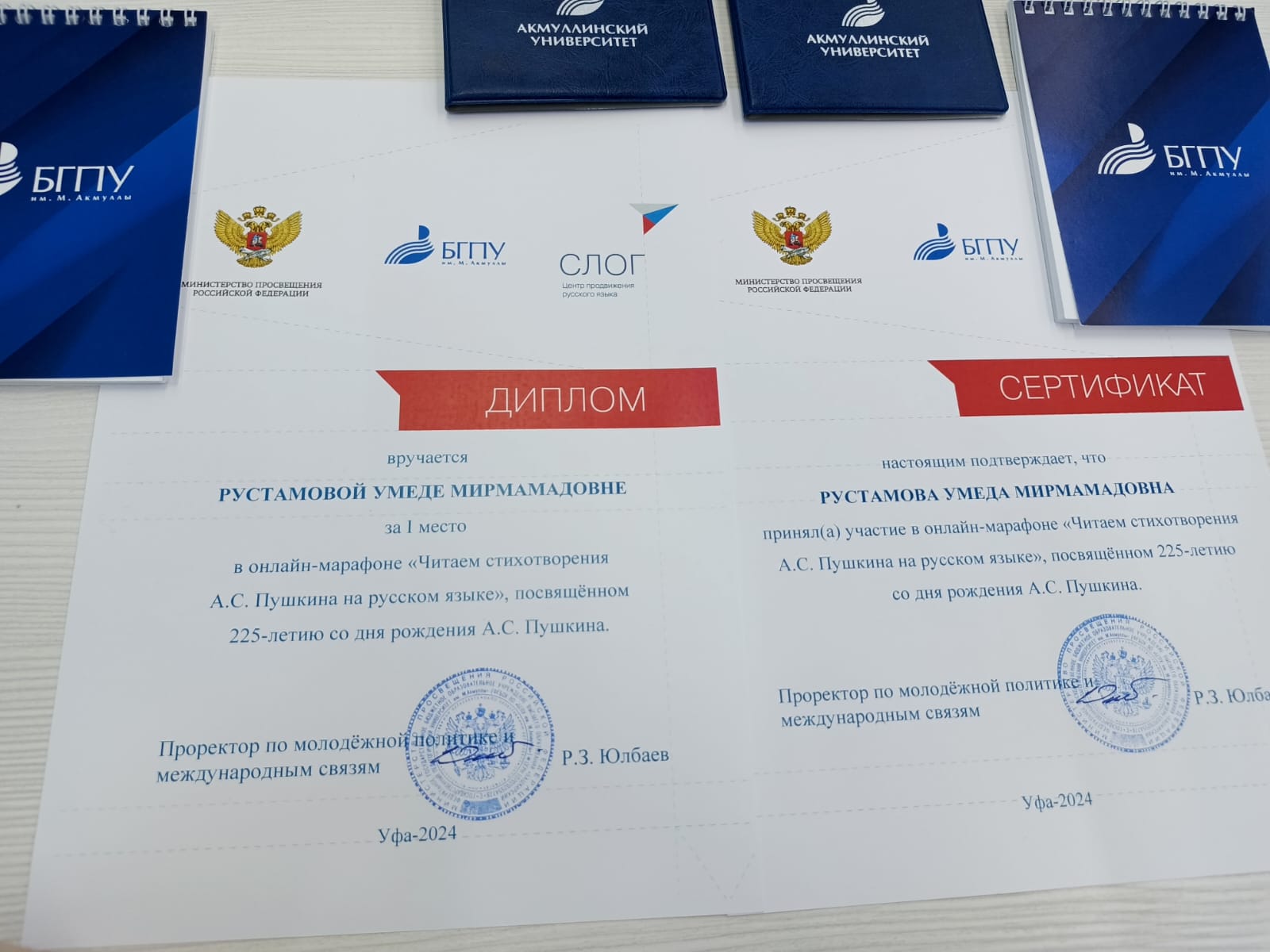 Участники марафона Рустамова Умеда (студентка 2 курса группы ЛИНПП-21-22) и Ризвонов Мироджиддин (магистрант 1 курса МЛТППД-11-23) получили сертификаты об участии, а Умеда Рустамова была также удостоена диплома за 1 место. Дипломы, сертификаты и памятные сувениры с символикой БГПУ им. М. Акмуллы были вручены ребятам 6 июня 2024 года  в торжественной обстановке в День русского языка Радиком Зиннатовичем Юлбаевым, проректором по молодежной политике и международным связям  https://youtu.be/_WVQg1zZzlU?si=fAoug1lmVY8W33JD