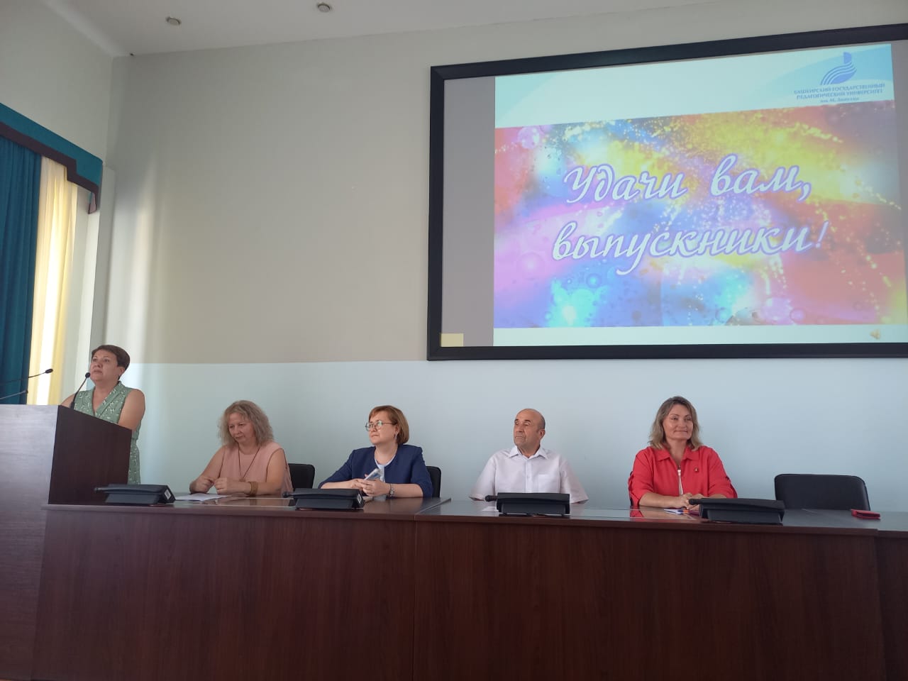 Выпускников поздравили:  начальник управления государственной политики в сфере общего образования министерства образования и науки Республики Башкортостан Жанна Вильевна Минекеева и выпускник нашего университета, учитель английского языка высшей квалификационной категории, заместитель директора по учебно-воспитательной работе гимназия № 3 им. М. Горького (г. Уфа) Байбурин Эльгиз Мидхатович.