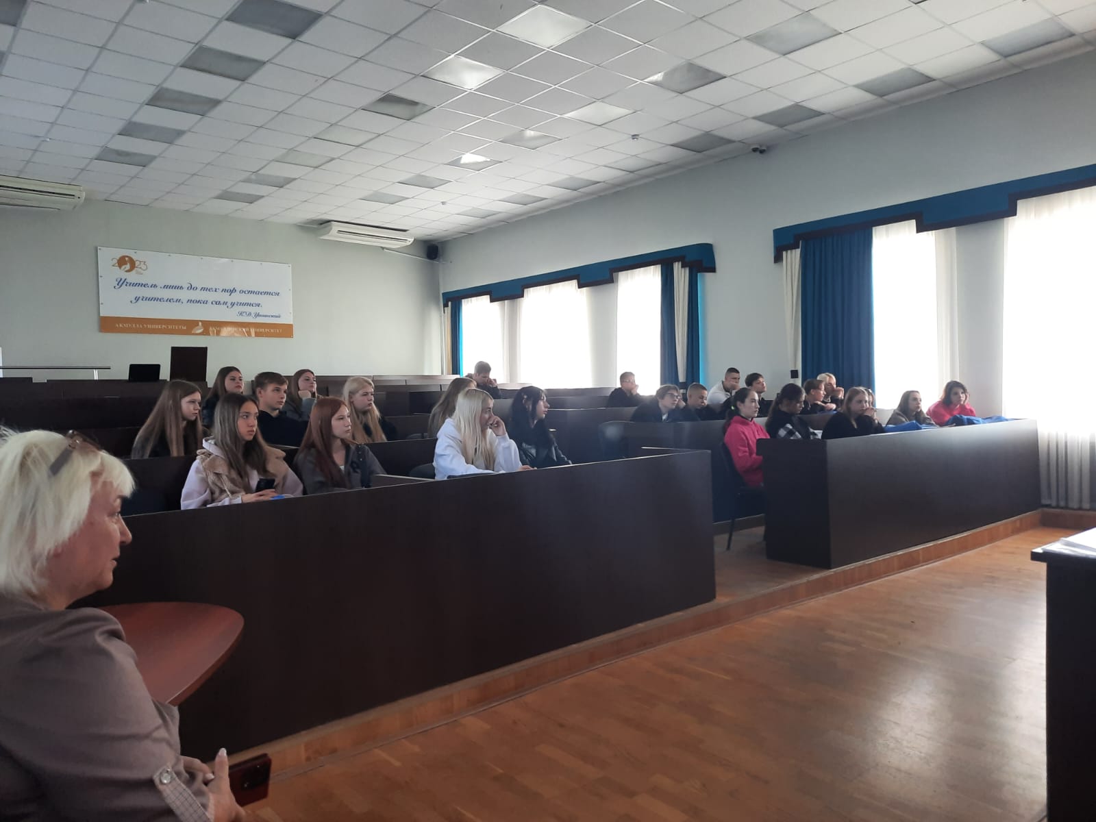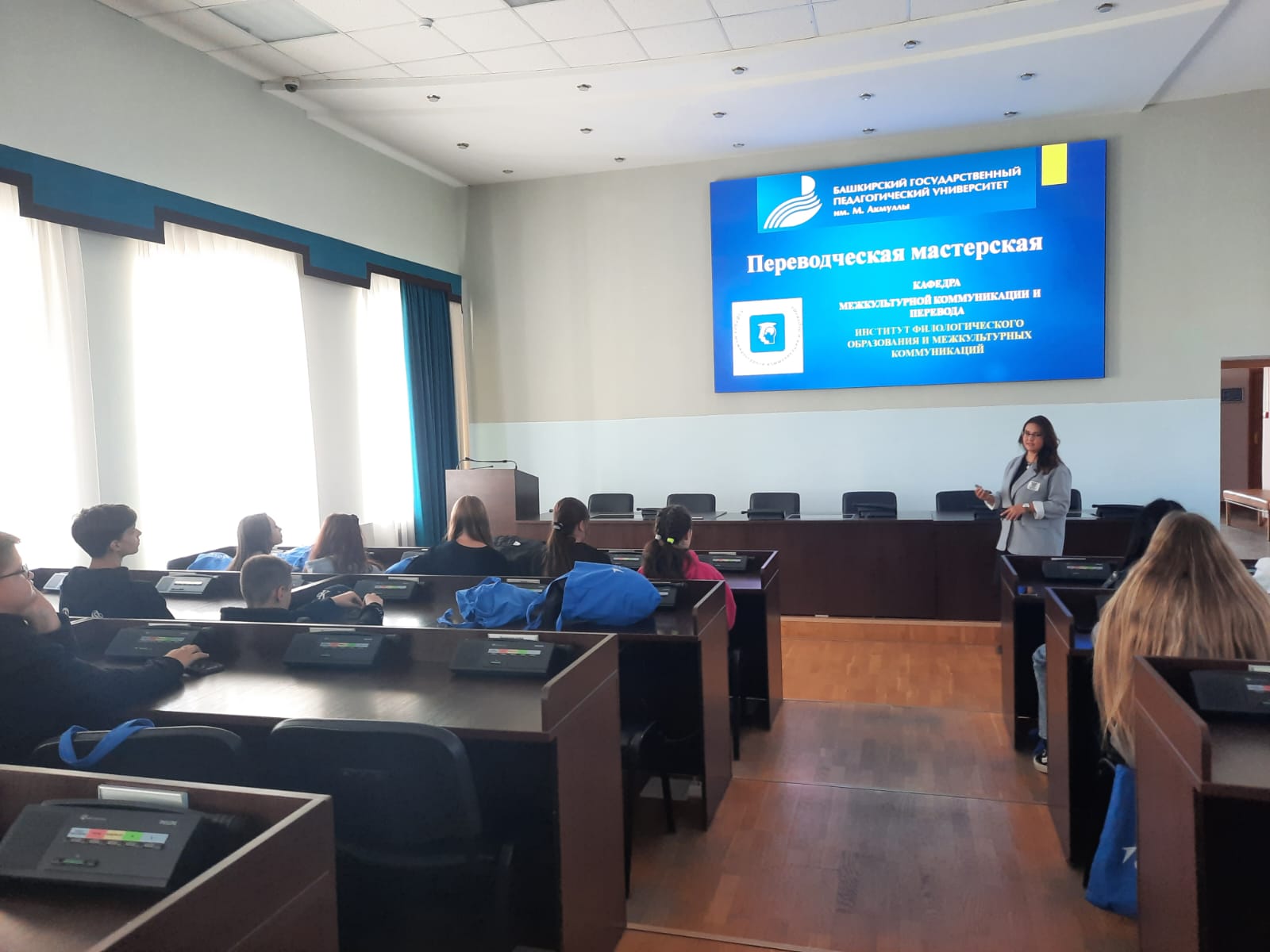 Яркая и насыщенная программа для почти 50 учащихся Луганского гуманитарно-экономического лицея-интерната, Перевальской гимназии №1, Артемовской средней школы №8 началась с профессиональных проб. Доцент кафедры межкультурной коммуникации и перевода Семенова Полина Викторовна провела тренинг «Переводческая мастерская», в рамках которого ребята познакомились с историей и особенностями профессии переводчика, поиграли в интерактивные игры и выполнили увлекательные задания. В течение всей смены для школьников пройдут спортивные мероприятия, различные тренинги, конкурсы, мотивационные игры и занятия, а также запланирована обзорная экскурсия по историческому центру Уфы.