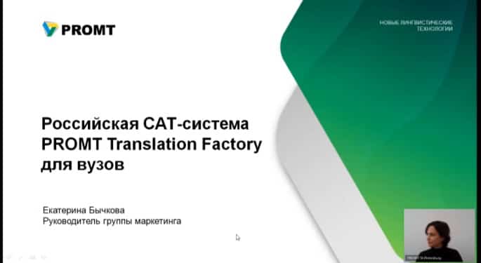 В рамках этого вебинара были представлены новая российская разработка переводческого инструмента САТ компанией PROMT и открытый онлайн-курс для преподавателей перевода, который позволит приблизить переводческую подготовку обучающихся к реалиям отрасли. Организаторы вебинара уверены, этот проект станет еще одним примером успешного взаимодействия между академической средой и отраслью.