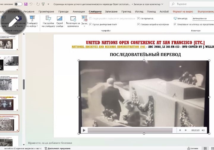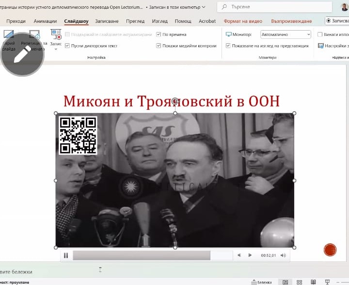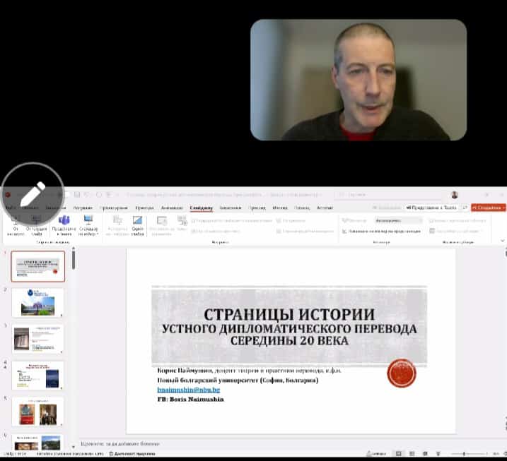 Лектором выступил Борис Анатольевич Наймушин, к.филол.наук, доцент теории и практики перевода кафедры «Иностранные языки и культуры» Нового болгарского университета. Лекция была посвящена вопросам изучения истории дипломатического перевода периода на основе комплексного изучения и сопоставления доступных письменных источников (мемуаров и архивных документов) и фото- и киноматериалов.