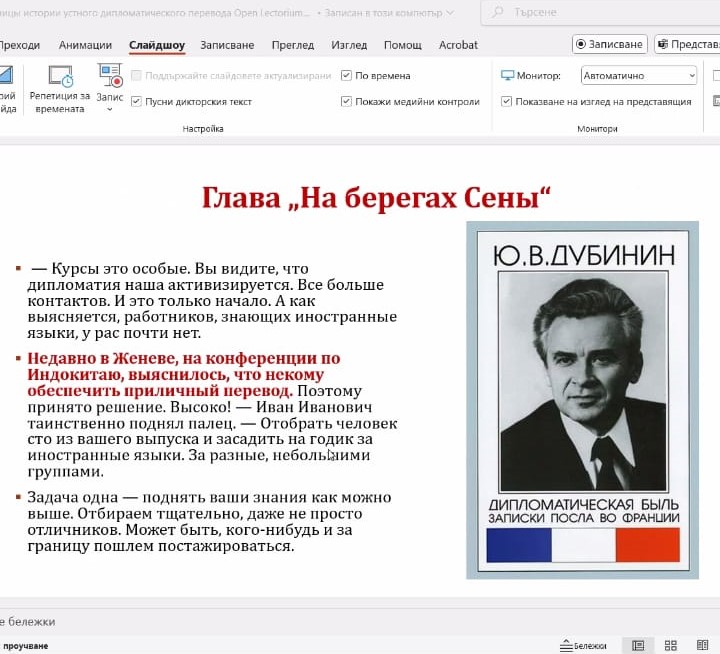 Второе мероприятие – лекция "Страницы истории устного дипломатического перевода середины 20 века", организованная Департаментом иностранных языков МФТИ в рамках проекта "Открытый лекторий".