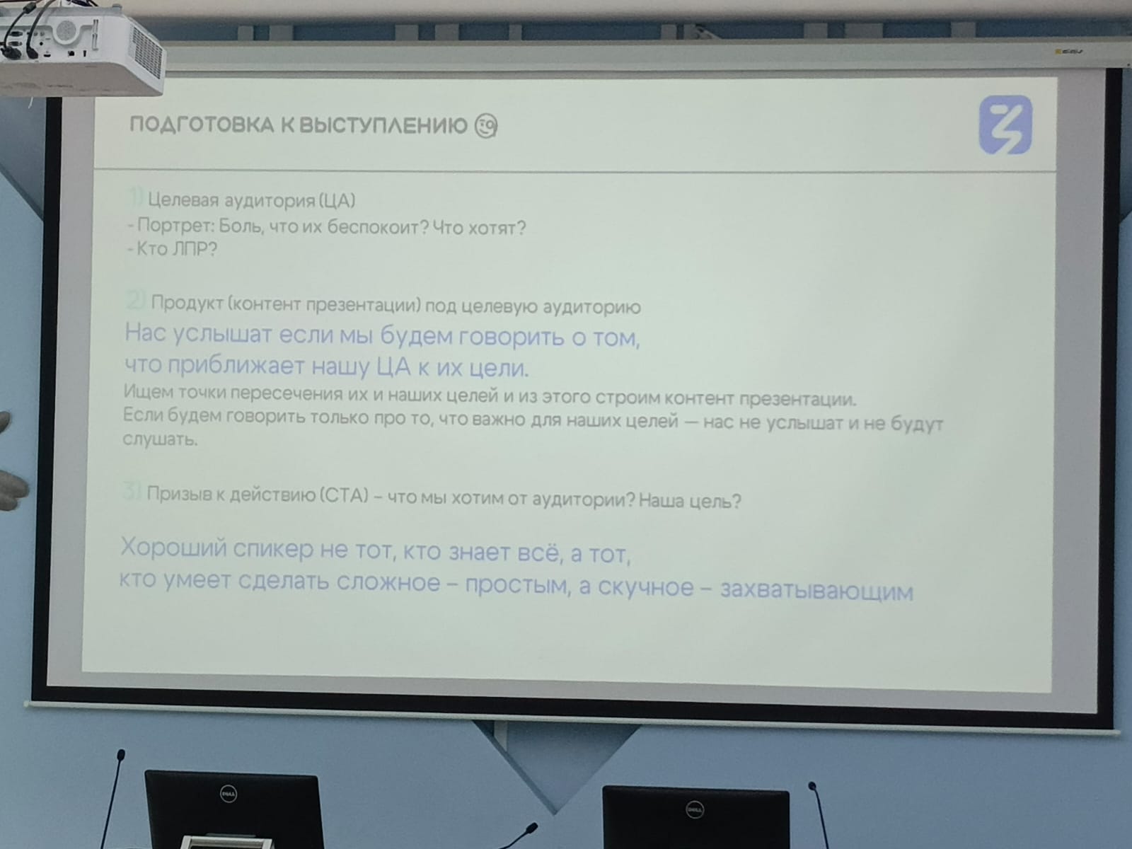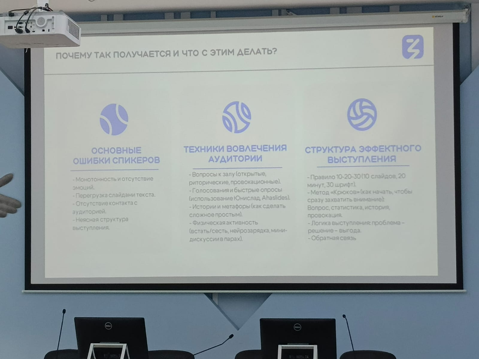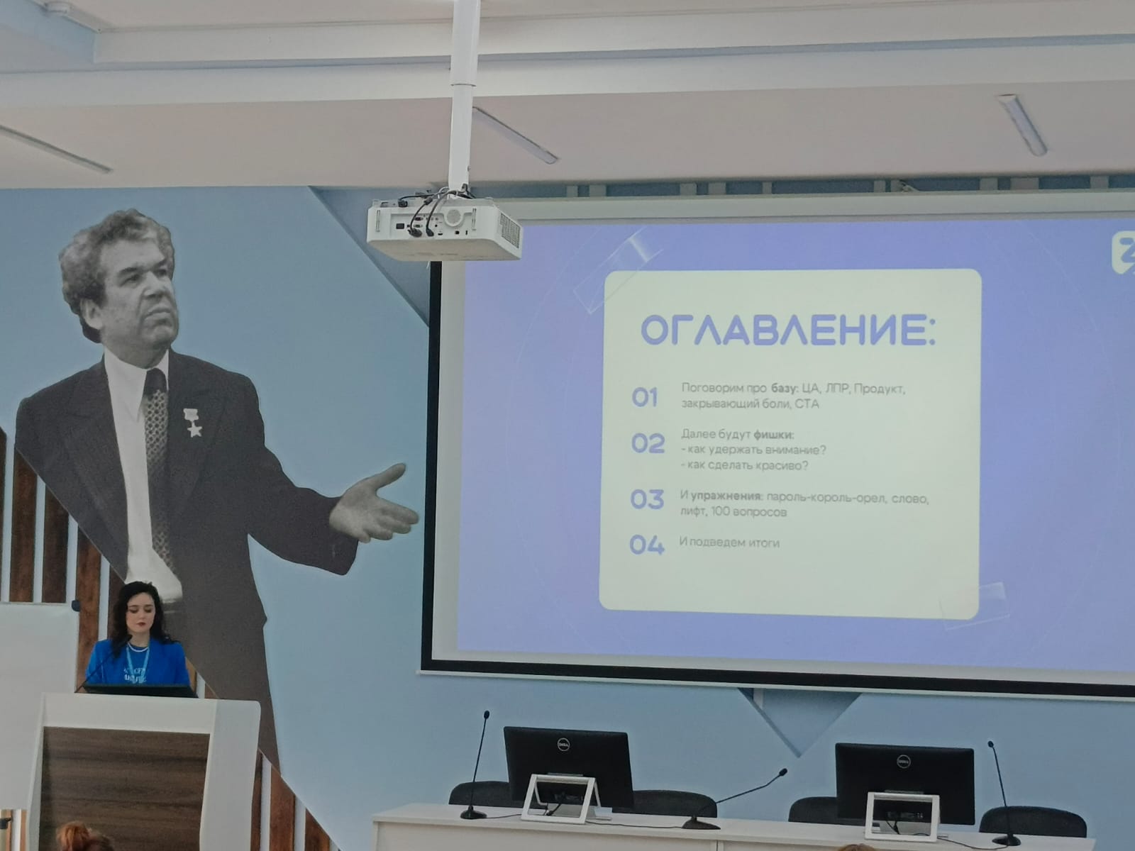 Дилара Ильдаровна рассказала об основных ошибках спикеров, о том, как вовлечь слушателей и удерживать их внимание во время выступления, как правильно и эффективно выстроить структуру выступления с учетом целевой аудитории. Лектор поделилась полезной информацией об интернет-ресурсах, которые можно использовать при подготовке презентаций и провела небольшой мастер-класс по развитию ораторских навыков.