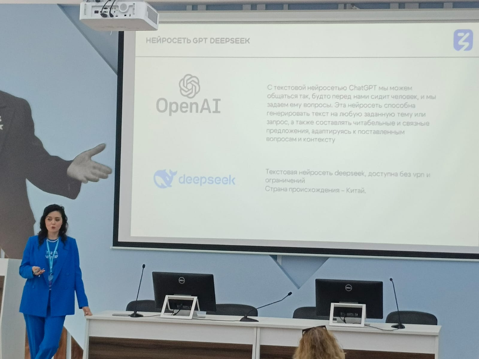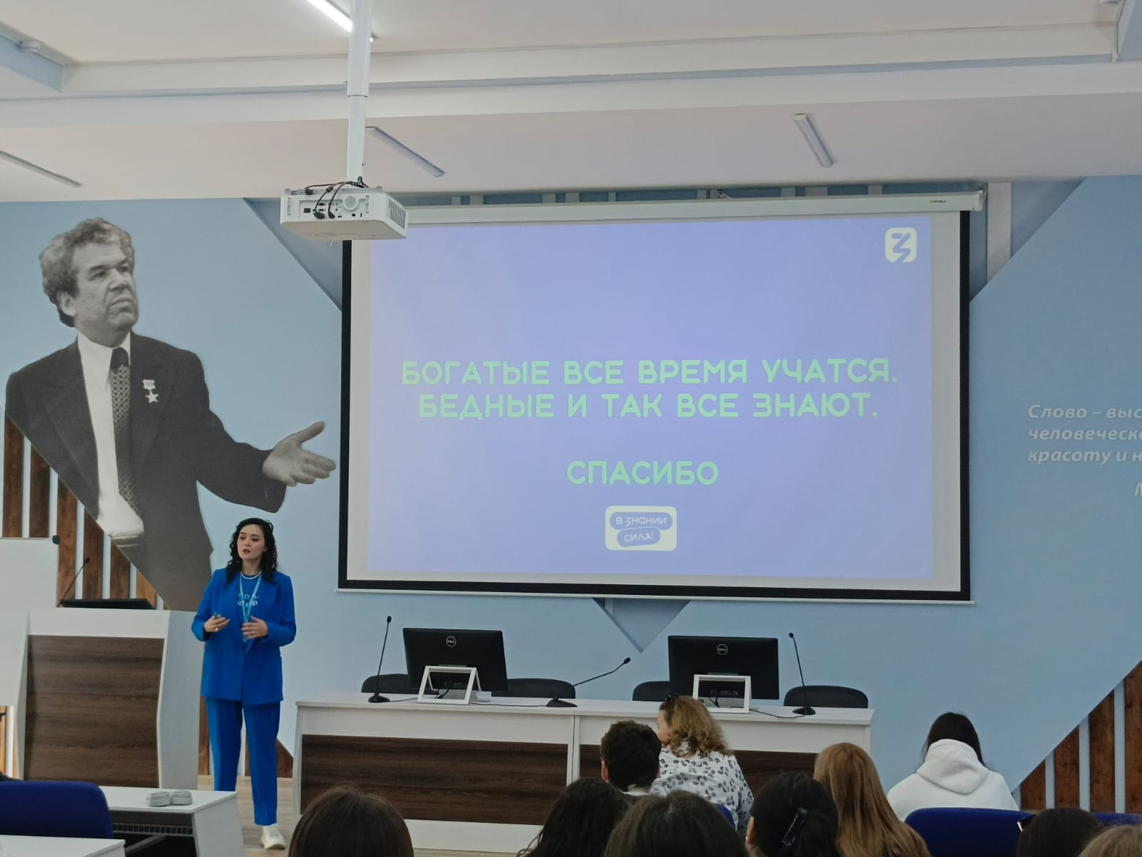 21 мая 2025 г. состоялась лекция лектора Российского общества "Знание" Д.И. Яппаровой "Мастерство публичных выступлений и эффектных презентаций". Лекцию посетили доцент кафедры межкультурной коммуникации и перевода Екатерина Владимировна Оботнина и студенты группы ЛИНПП-12-24 направления 45.03.02 Лингвистика.