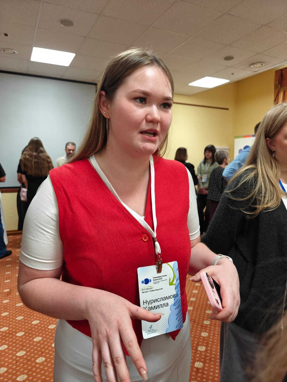 Нурисламова Камилла: «ТФР - это моя первая в жизни серьезная конференция, связанная с карьерой переводчика. Первый день я чувствовала себя самозванкой среди специалистов, у которых опыта больше, чем мне лет... Но, взяв себя в руки, я начала вступать в диалоги с другими участниками, расспрашивала всех обо всем, что можно и наслаждалась процессом погружения в профессию. Очень было приятно встретить на форуме «наших» - выпускников ИФОМК! Лекции, обсуждения, мастер-классы и игры - отдельная любимая часть всего форума… Впрочем, я уже готова бронировать место на следующий год!»