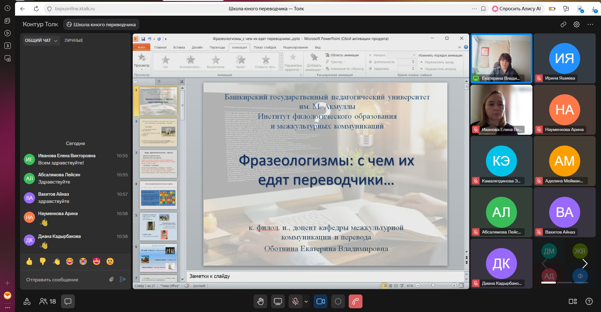 Занятие на тему «Фразеологизмы: с чем их едят переводчики» провела к.ф.н., доцент кафедры межкультурной коммуникации и перевода Екатерина Владимировна Оботнина.