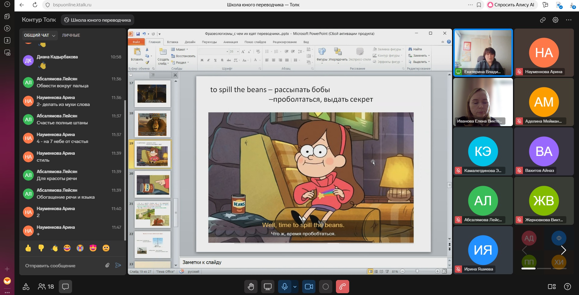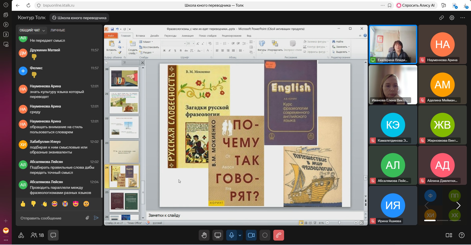 Были рассмотрены вопросы, связанные с определением фразеологических единиц, их видами, значением, а также происхождением. Основная часть лекции была посвящена вопросам перевода фразеологизмов, рассмотренных на примерах, взятых из художественных произведений, фильмов и мультфильмов, а также из нефтегазовой сферы. В конце занятия слушателям школы было предложено ответить на вопросы, связанные с темой лекции. Ребята принимали самое активное участие и поблагодарили Екатерину Владимировну за столь интересную подачу материала. В течение недели они, как обычно, будут выполнять задание по теме лекции, а насколько правильно им удалось его сделать, узнают к следующему занятию.