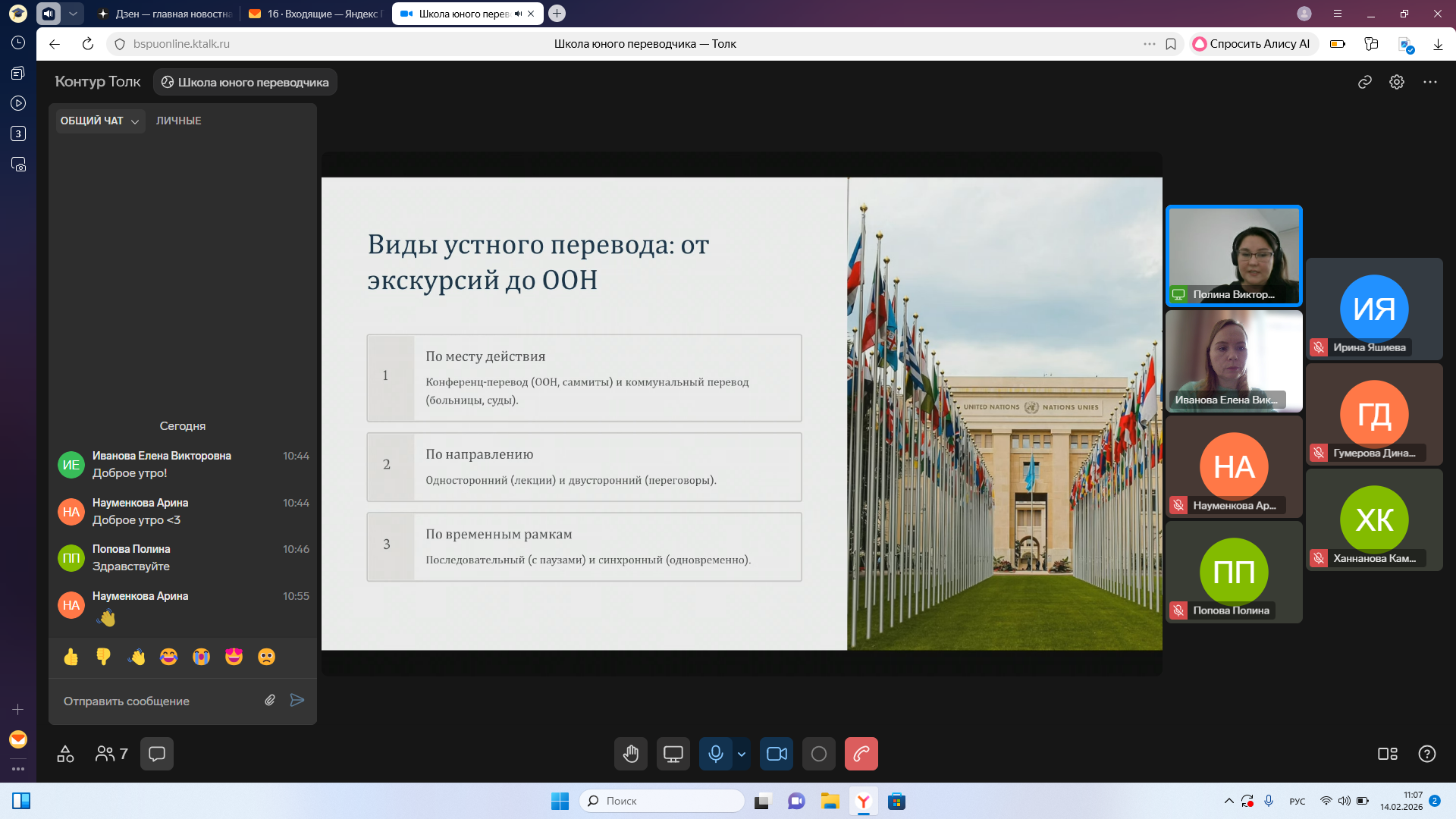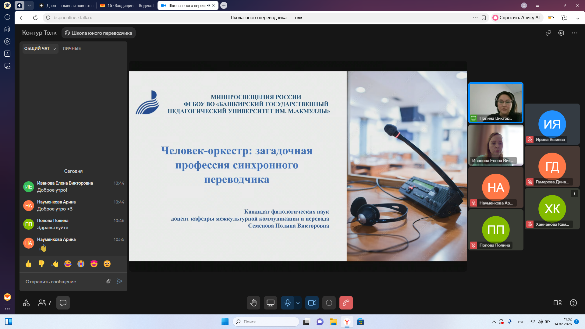 14 февраля 2026 г. состоялось седьмое занятие на обучающем курсе «Школа юного переводчика», проводимом кафедрой межкультурной коммуникации и перевода Башкирского государственного педагогического университета им. М. Акмуллы для учащихся 10-11 классов общеобразовательных учреждений РФ с целью их профессионального ориентирования.