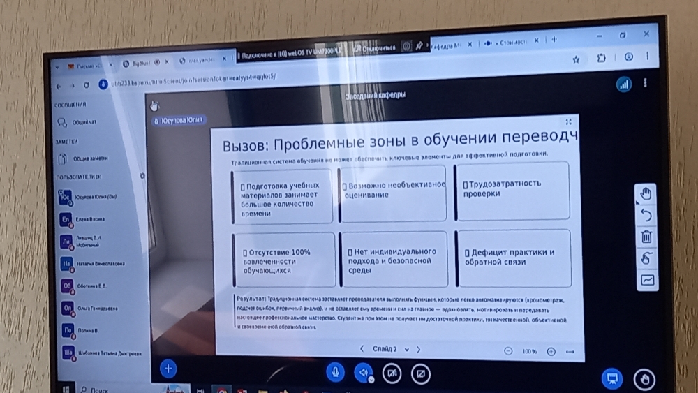В ходе проведенных в гибридном формате НМС Альфия Гаптелхановна Губайдуллина и Полина Викторовна Семенова презентовали проект «ИИ-ассистент оценки устного перевода», разработанный ими после прохождения курсов повышения квалификации «Генеративный искусственный интеллект для вузов: проектирование решений» в Уральском федеральном университете имени первого Президента России Б.Н. Ельцина.