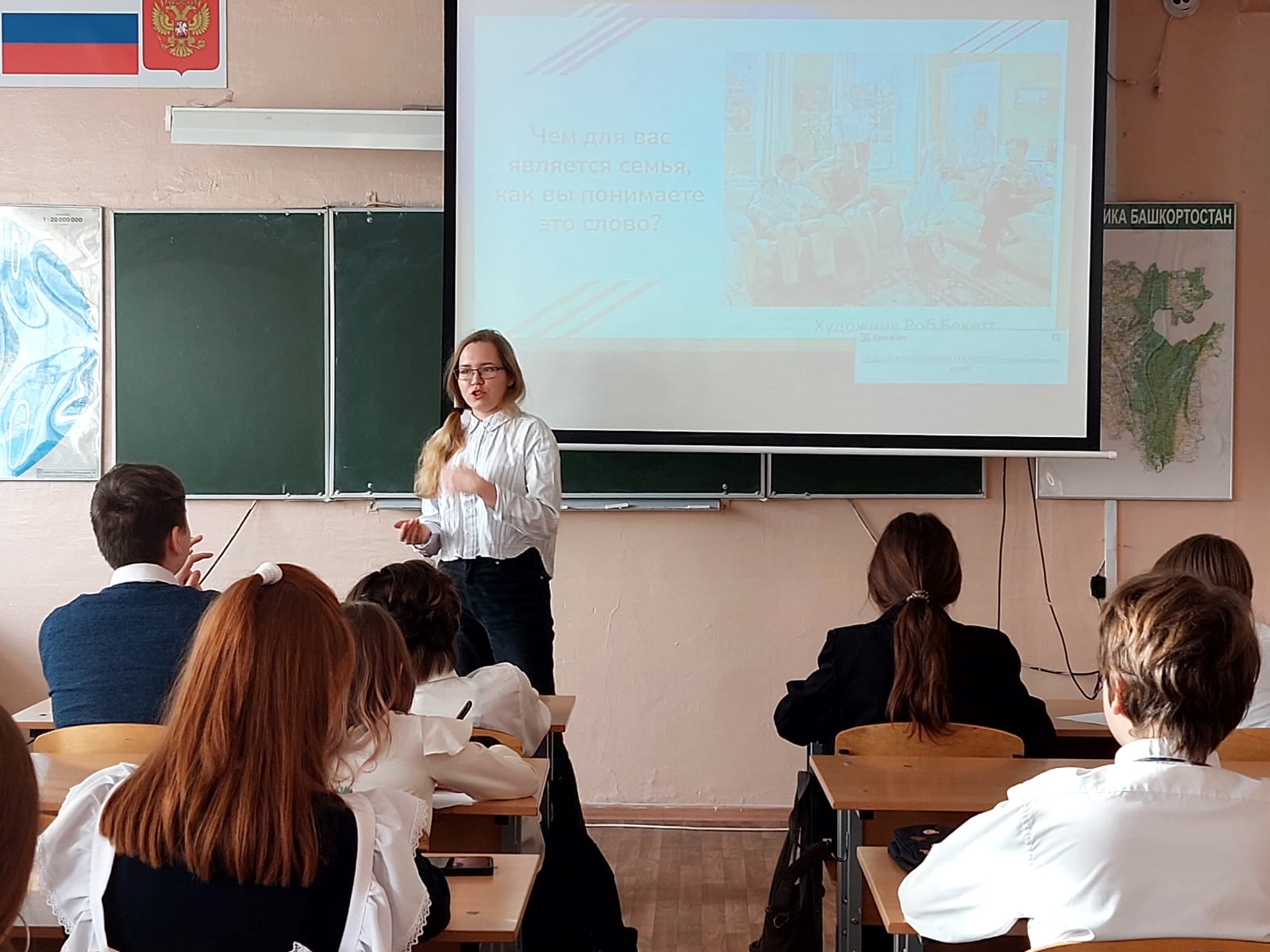 20 ноября 2023 года студенты 5 курса Института филологического образования и межкультурных коммуникаций направления подготовки Педагогическое образование, направленность (профиль) «Русский язык и литература» провели внеурочные занятия «Разговоры о важном» для обучающихся 7 и 11 классов базовых школ Акмуллинского университета: МАОУ «Школа № 41», МАОУ «Школа № 22» г. Уфы. Студенты Виноградова Ксения и Тойгильдина Илена под руководством заведующей кафедрой русской литературы Ю.А. Шаниной разработали презентационный и дидактический материал по теме «Взаимоотношения в семье», обратившись к культурологическому и литературному материалу, который обладает большим воспитательным потенциалом.