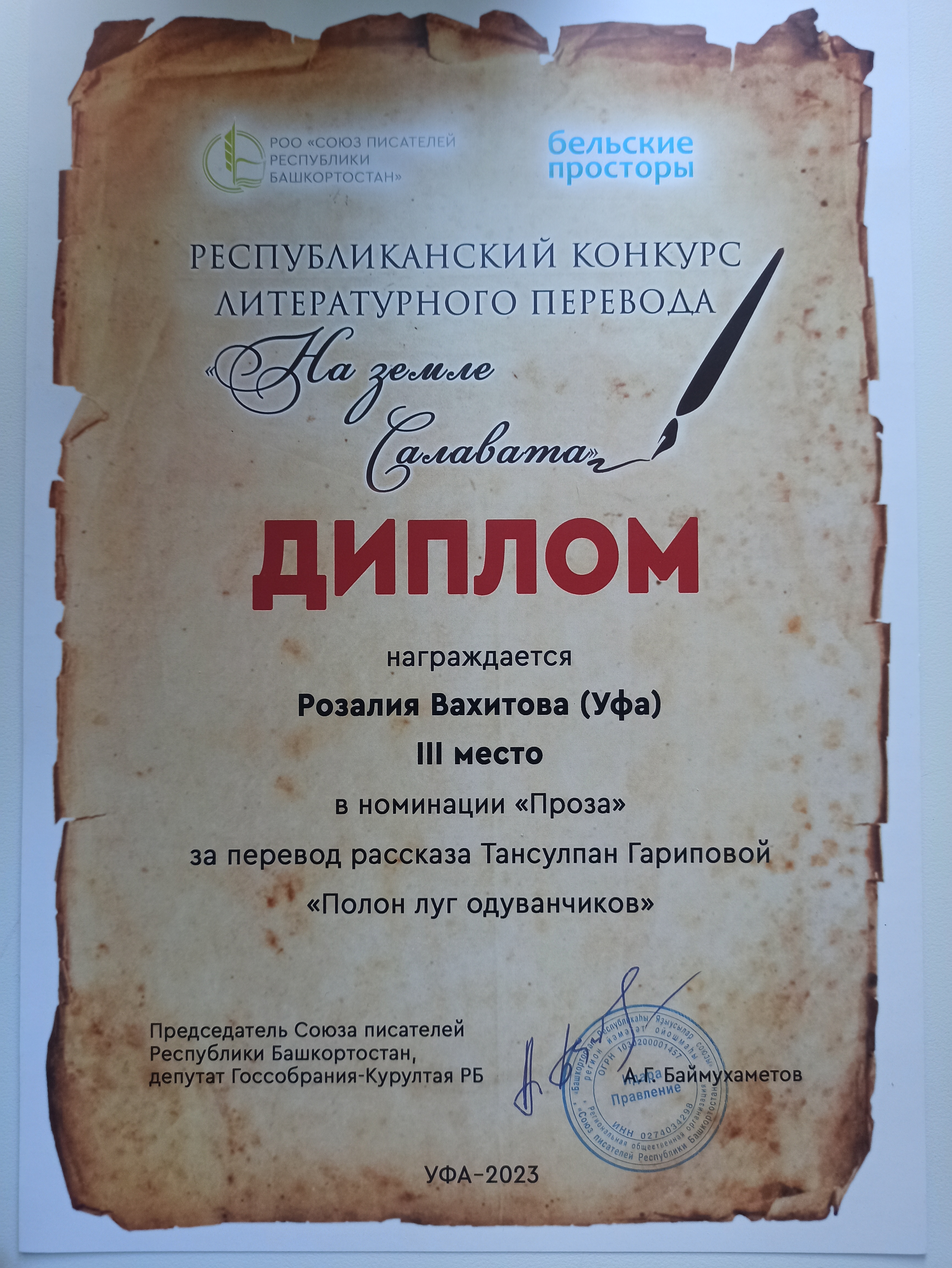 В декабря 2023 года в Уфе были подведены итоги Республиканского конкурса художественного перевода «На земле Салавата», который был организован Союзом писателей Республики Башкортостан и уфимским литературно-художественным журналом «Бельские просторы». В этом издании будут опубликованы лучшие работы.На конкурс поступило 190 заявок из 84 населённых пунктов сорока субъектов Российский Федерации, а также от граждан других стран (Беларусь, Казахстан, Норвегия, Турция). В этом издании будут опубликованы лучшие работы. Всего на конкурс пришло 698 переводов стихотворений, пять переводов поэм, в том числе одна сказка в стихах, 41 перевод рассказов, 15 переводов повестей, два перевода сказок, два перевода отрывков из романа.