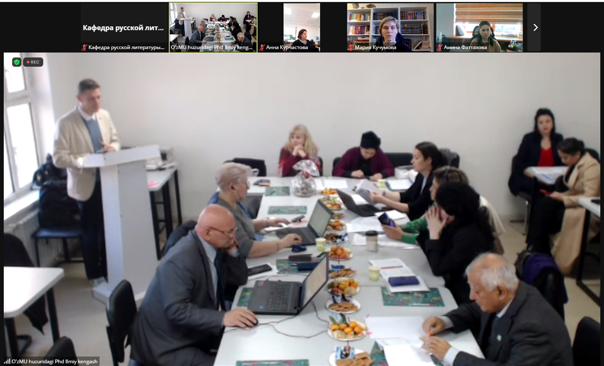 28 декабря 2023 года состоялось заседание Ученого совета Национального университета Узбекистана имени Мирзо Улугбека по защите диссертации Ротанова Алексея Николаевича «Репрезентация графического романа в современной русской прозе» на соискание ученой степени доктора философии в области филологических наук. В качестве официального оппонента в ходе защиты выступила доцент кафедры русской литературы Мария Олеговна Кучумова. Положения диссертационного исследования вызвали живую дискуссию среди участников заседания, так как они затрагивают актуальные процессы в современного российской художественной прозе. По результатам публичной защиты соискателю была присуждена искомая степень.