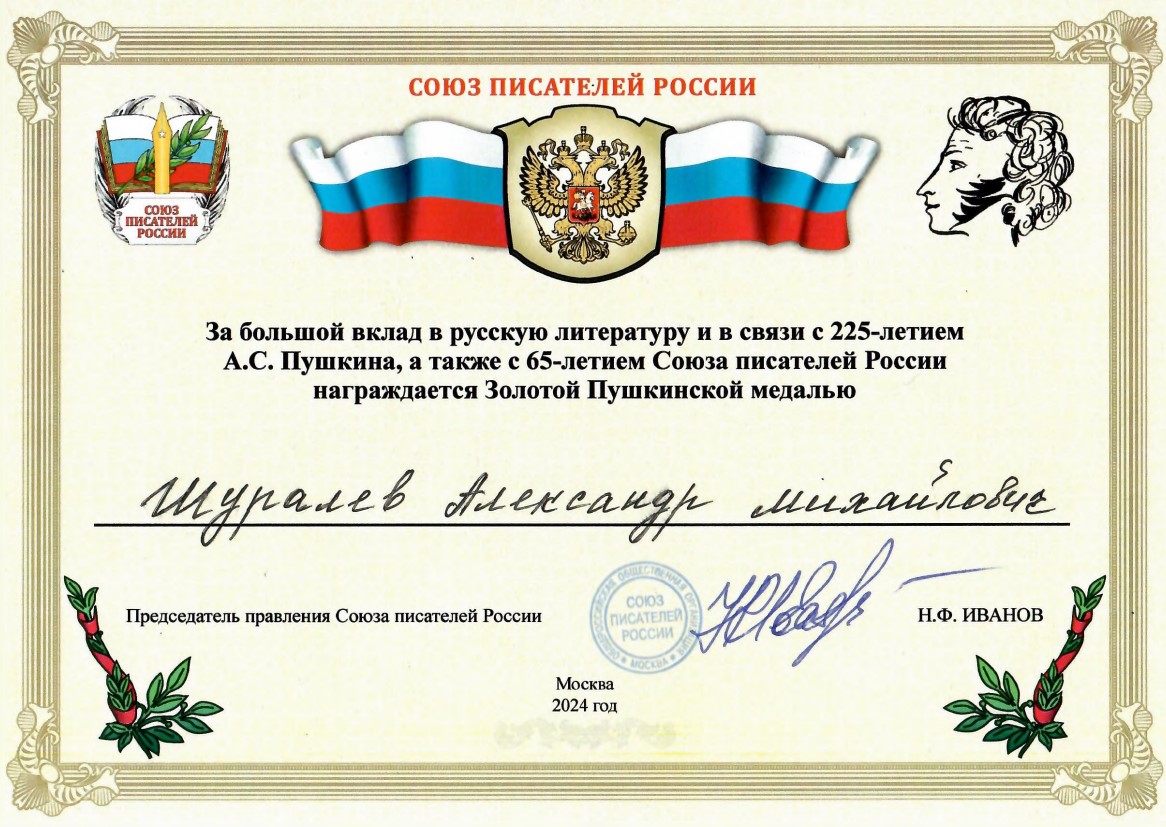 Профессор Александр Шуралёв награждён Золотой Пушкинской медалью