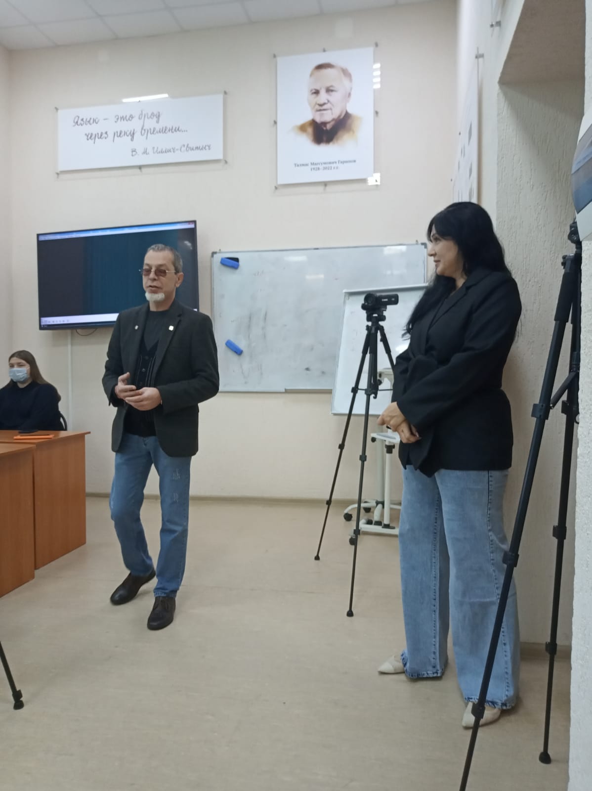 В гости к студентам-филологам приехали заместитель главного редактора московской «Литературной газеты», председатель русского литературного общества, главный редактор интернет-журнала «Культнавигатор РФ», составитель Русской литературной Энциклопедии, главный редактор книжной серии «Библиотека Русского географического общества» Александр Александрович Чистяков и пресс-секретарь «Литературной газеты» и Русского Литературного общества Вероника Евгеньевна Одинцова. На круглом столе также присутствовали доцент кафедры русской литературы И.О. Прокофьева, новосибирский поэт, переводчик, журналист Ю.А. Татаренко, уфимский поэт-сатирик В.В. Кузьмичёв.