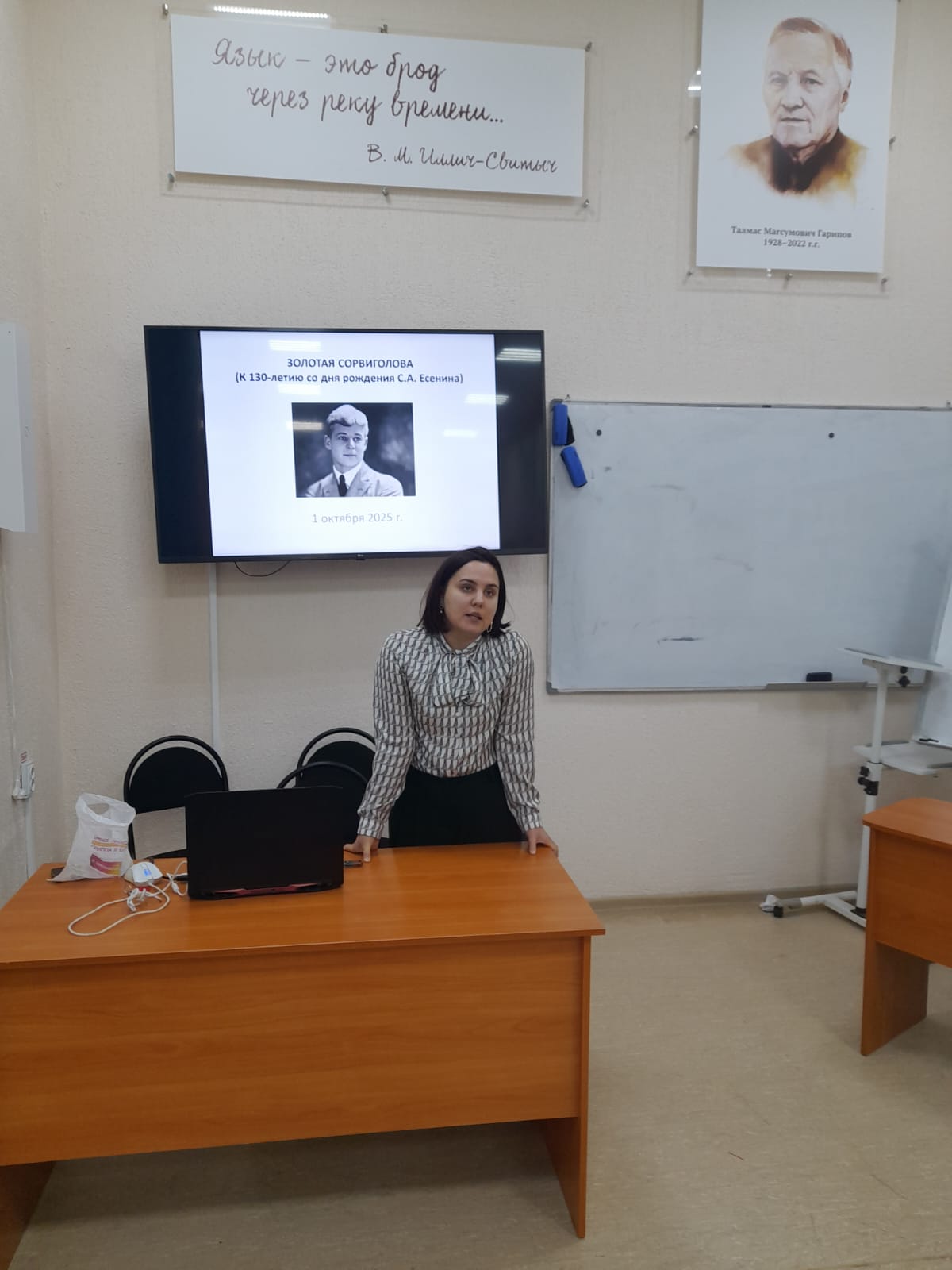 7 ноября 2025 года в Институте филологического образования и межкультурных коммуникаций состоялось мероприятие, посвященное 130-летию со дня рождения и 100-летию со дня смерти Сергея Есенина (1895-1925). Участники театральной студии «Мельпомена» лицея № 161 г. Уфы совместно со студентами 4 курса направления подготовки «Русский язык и литература» представили литературную композицию «Золотая сорвиголова».