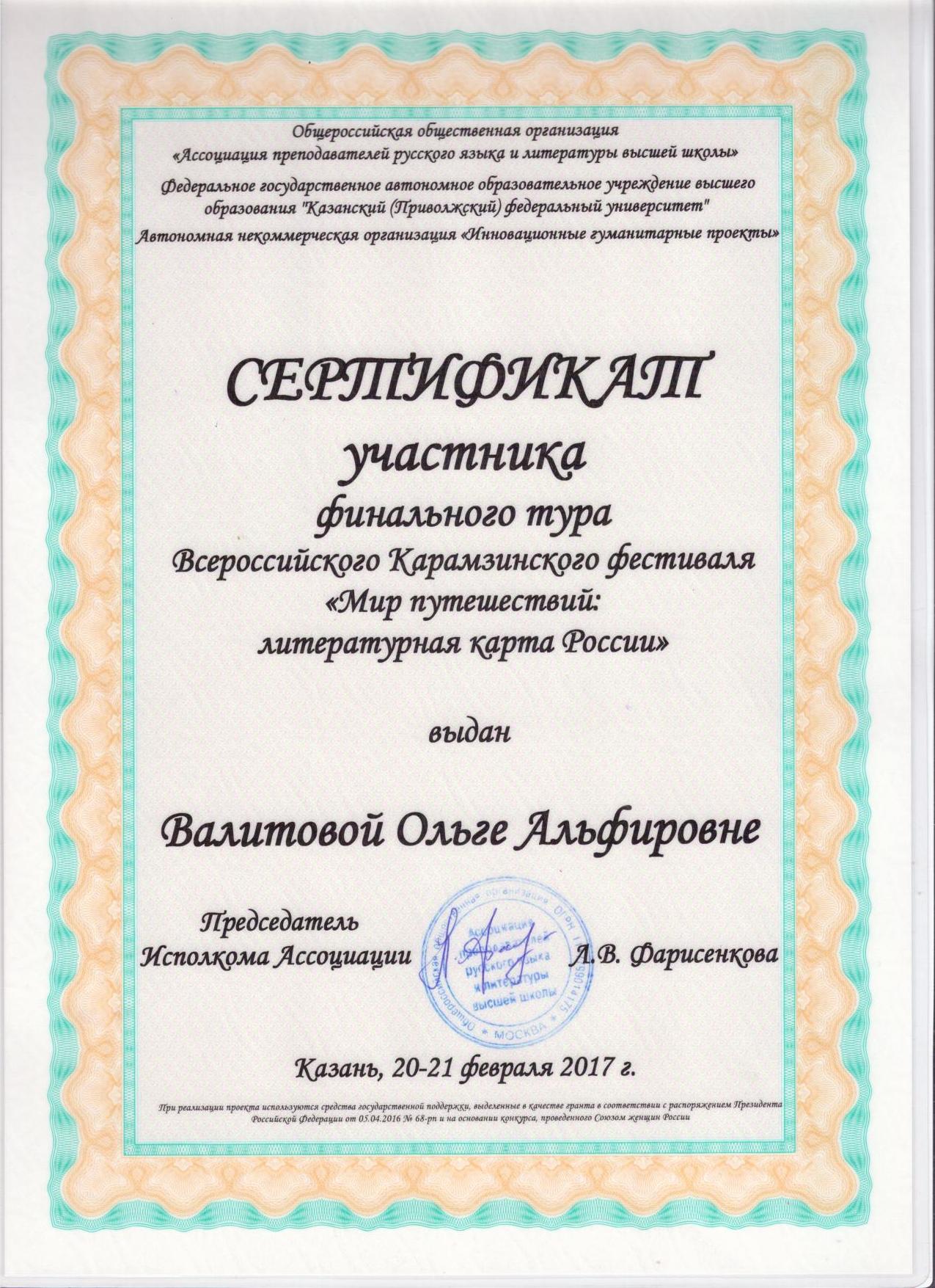 20-21 февраля 2017 года в Казани состоялось закрытие Всероссийского Карамзинского фестиваля, в котором приняли участие студенты 2-3 курсов ИФОМК (профиль «Русский язык и литература»). Победителями регионального тура фестиваля стали Валитова Ольга и Трубина Ирина. Их проект «Литературная гостиная “Великий гражданин земли русской”» был оценен в ряду других исследовательских и творческих работ, представленных от 10 регионов России. Программа фестиваля включала в себя не только презентацию проектов, но и встречу с учеными Казанского федерального университета, знакомство с достопримечательностями столицы Татарстана. Ассоциация преподавателей русского языка и литературы высшей школы выразила благодарность организатору регионального тура фестиваля профессору В.В. Борисовой.