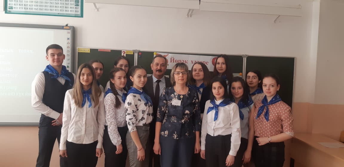 Кстати, в этот день в стенах гимназии как раз проходили открытые уроки участников Республиканского конкурса «Учитель года татарского языка и литературы-2020». Мы присутствовали на открытом классном часе «Без хәтерлибез, без горурланабыз» («Мы помним, мы гордимся») участника конкурса Р.М. Гиззатуллиной – учительницы татарского языка и литературы МАОУ «Татарская гимназия с отделением искусства г. Белебея». Данный классный час был посвящен 75-летию Великой Победе, в ходе которого ученики написали письма ветеранам войны и труда в форме фронтового треугольника времен Великой Отечественной войны.