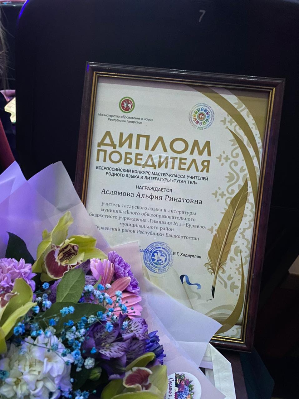 В конце марта в г. Казань состоялся Всероссийский конкурс мастер-классов учителей родных языков «Туган тел» (учителей татарского, русского, марийского, мордовского, удмуртского, чувашского языков). Конкурс проводится уже более 20 лет подряд, лишь в прошлом году был отменен в связи с пандемией. В этом году от Республики Башкортостан в Конкурсе участие приняла учительница татарского языка и литературы МОБУ «Гимназия № 2 с. Бураево» МР Бураевский район Аслямова Альфия Ринатовна – призер Республиканского конкурса «Лучший учитель татарского языка и литературы 2019 года».