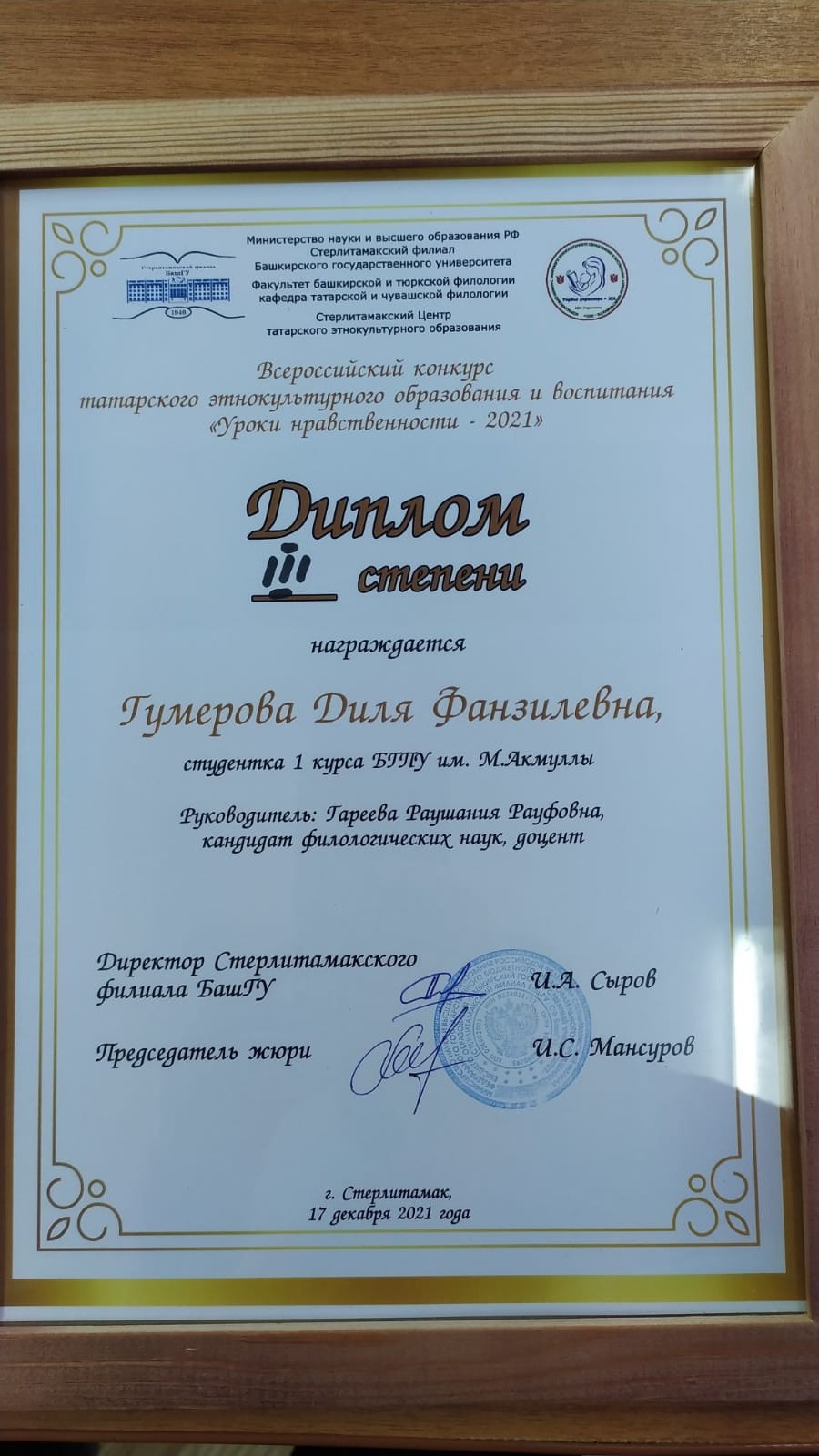17 декабря  состоялся заключительный этап Всероссийского конкурса татарского этнокультурного образования и воспитания "Тәрбия дәресләре - 2021/Уроки нравственности - 2021". Конкурс был организован в Стерлитамакском филиале Башкирского государственного университета на базе факультета башкирской и тюркской филологии. Целью данного мероприятия было развитие профессиональных компетенций у будущих педагогов и воспитателей по татарскому этнокультурному образованию и воспитанию.