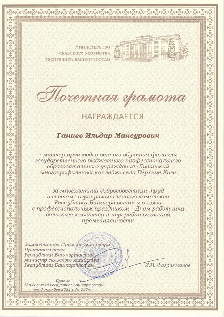Недавно И.М. Ганиев получил Почетную грамоту Министерства сельского хозяйства Республики Башкортостан за многолетний добросовестный труд в системе агропромышленного комплекса РБ и в связи с профессиональным праздником – Днем работников сельского хозяйства и перерабатывающей промышленности, подписанный Заместителем Премьер-министра Правительства РБ, министром сельского хозяйства РБ И.И. Фазрахмановым.