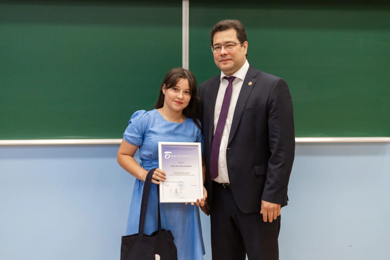 Студентка 5 курса направления 44.03.05 Педагогическое образование (с двумя профилями подготовки) направленность (профиль) «Родной (татарский) язык и литература и английский язык» Диана Сагабиева награждена Благодарственным письмом и ценными подарками за сохранение традиций и ценностей Акмуллинского университета и значительный вклад в научную деятельность вуза. Диана Фиратовна в течение 5 лет была старостой группы. Благодаря ее организаторским способностям, это была одной из сплоченных, активных коллективов в институте филологического образования и межкультурных коммуникаций. Она училась только на «отлично», вела активную научно-исследовательскую работу: выступила докладами в многочисленных конференциях, была победителем научно-методических, творческих конкурсов, удостоена повышенной государственной академической стипендии. В этой же группе обучалась её сестра-двойняшка Лиана Сагабиева. Диана собирается продолжать обучение в Акмуллинском университете по программе магистратуры «Русский язык и литература в полилингвальном образовательном пространстве». Желаем нашей выпускнице новых достижений!