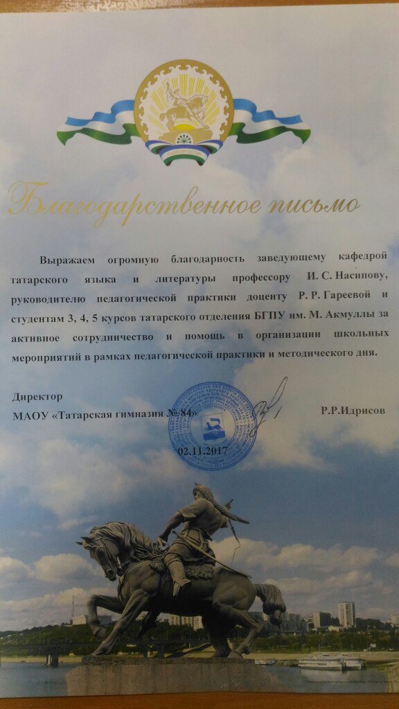1 декабря 2017 года состоялась отчетная конференция по научно-педагогической практике магистрантов ОДО и ОЗО 2 года обучения  Института филологического образования и межкультурных коммуникаций по направлению подготовки 44.04.01 Педагогическое образование (уровень магистратуры), направленность (профиль) «Язык в полилингвальной среде» ОДО и ОЗО. Базой для прохождения практики стала кафедра татарского языка и литературы ФГБОУ ВО БГПУ им. М.Акмуллы» и ФГБОУ ВО кафедра татарского языка и литературы БГПУ им. М.Акмуллы, МОБУ СОШ с. Нижние Киги МР Кигинский район РБ. Практикантами проведена научно-исследовательская работа по теме магистерской диссертации, подготовлены и проведены открытые лекции по дисциплинам “Современный татарский литературный язык”, “История родного языка”, “Филологический анализ художественного текста” со студентами направления “Педагогическое образование” профиль “Родной (татарский) язык и литература; профиль по выбору; разработаны ФОС (тесты, презентации, кейсы), также они участвовали в подготовке и организации мероприятий, организованных кафедрой татарского языка и литературы. Магистранты приобрели большой опыт научно-педагогической деятельности.