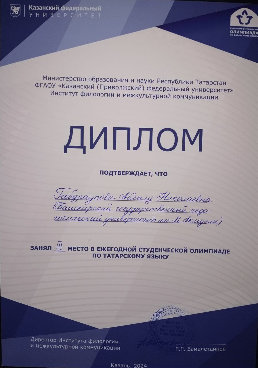 14-15 ноября студенты 2, 4 курсов Института филологического образования и межкультурных коммуникаций Галеева Нурсиба, Гиззатуллина Лиана, Гандалипова Азалия, Габдраупова Айсылу участвовали в ежегодной студенческой олимпиаде по татарскому языку в г. Казани. Олимпиада проводится Казанским (Приволжским) федеральным университетом на базе Института филологии и межкультурной коммуникации КФУ с целью повышения познавательного интереса молодежи к изучению татарского языка через выявление и развитие интеллектуальных, познавательных способностей, широты кругозора, умения творчески, нестандартно мыслить, демонстрации практической значимости изучения родного (татарского) языка для успешности в различных предметных областях.